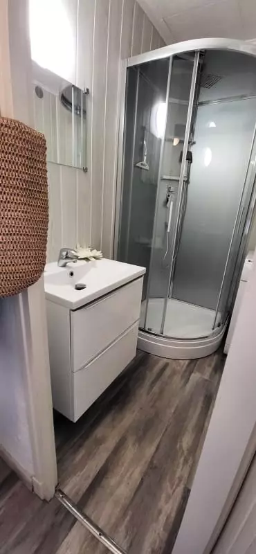 Salle de douche, vasque avec meuble à tiroir. Toilette.