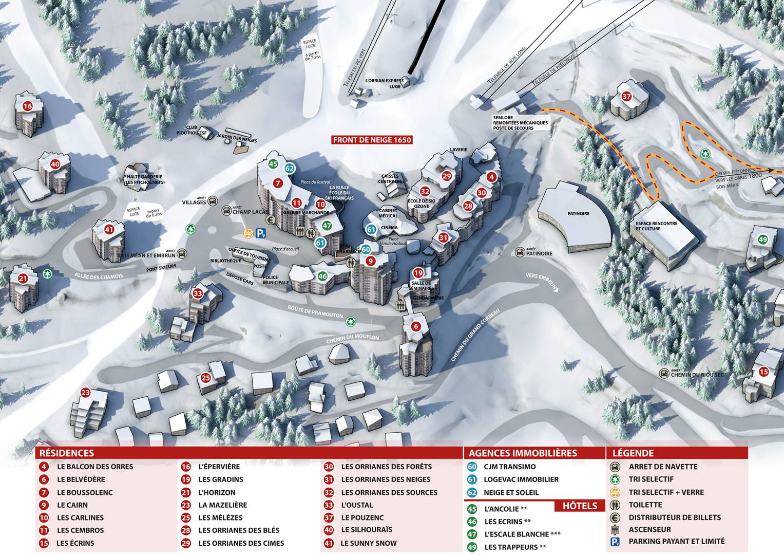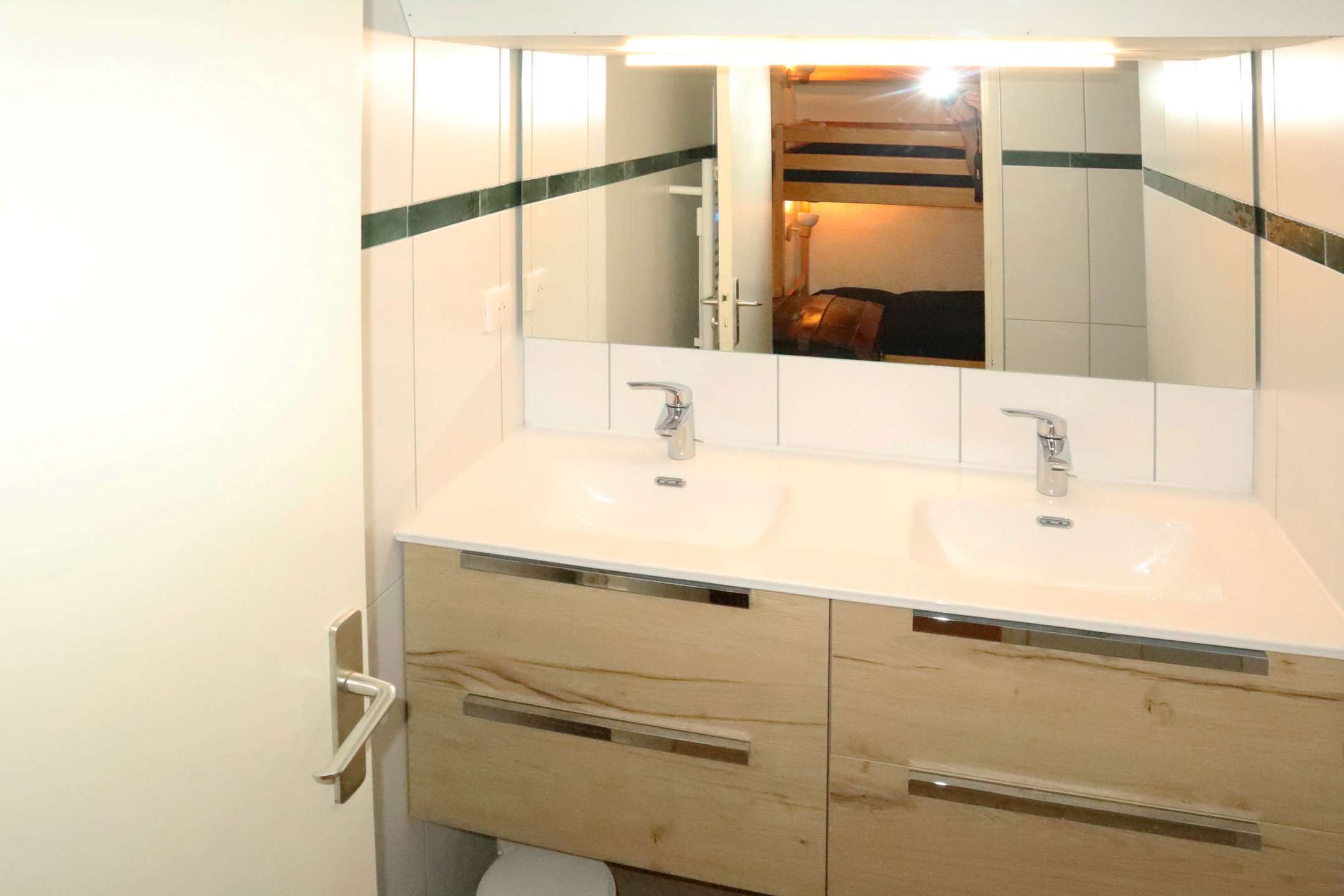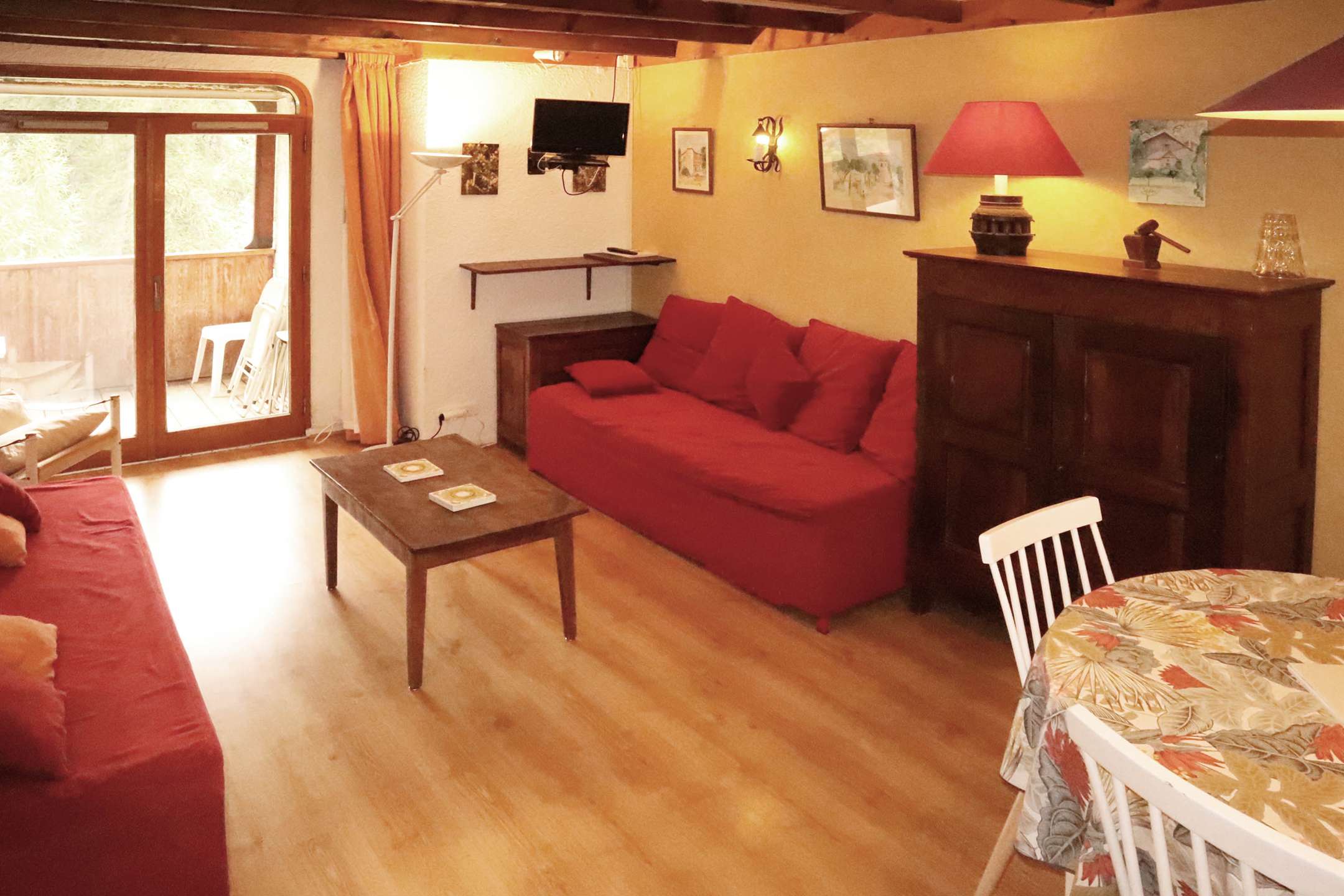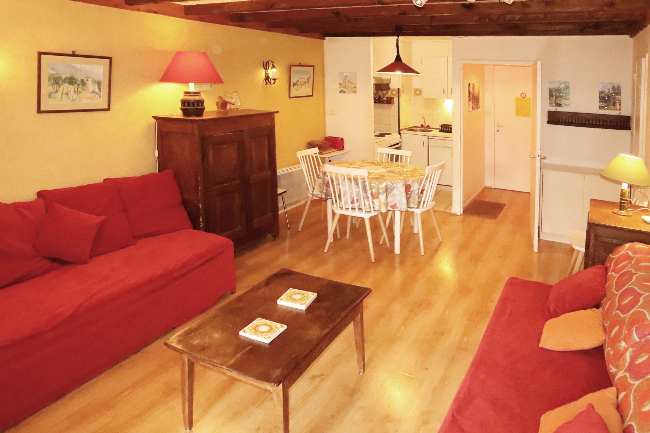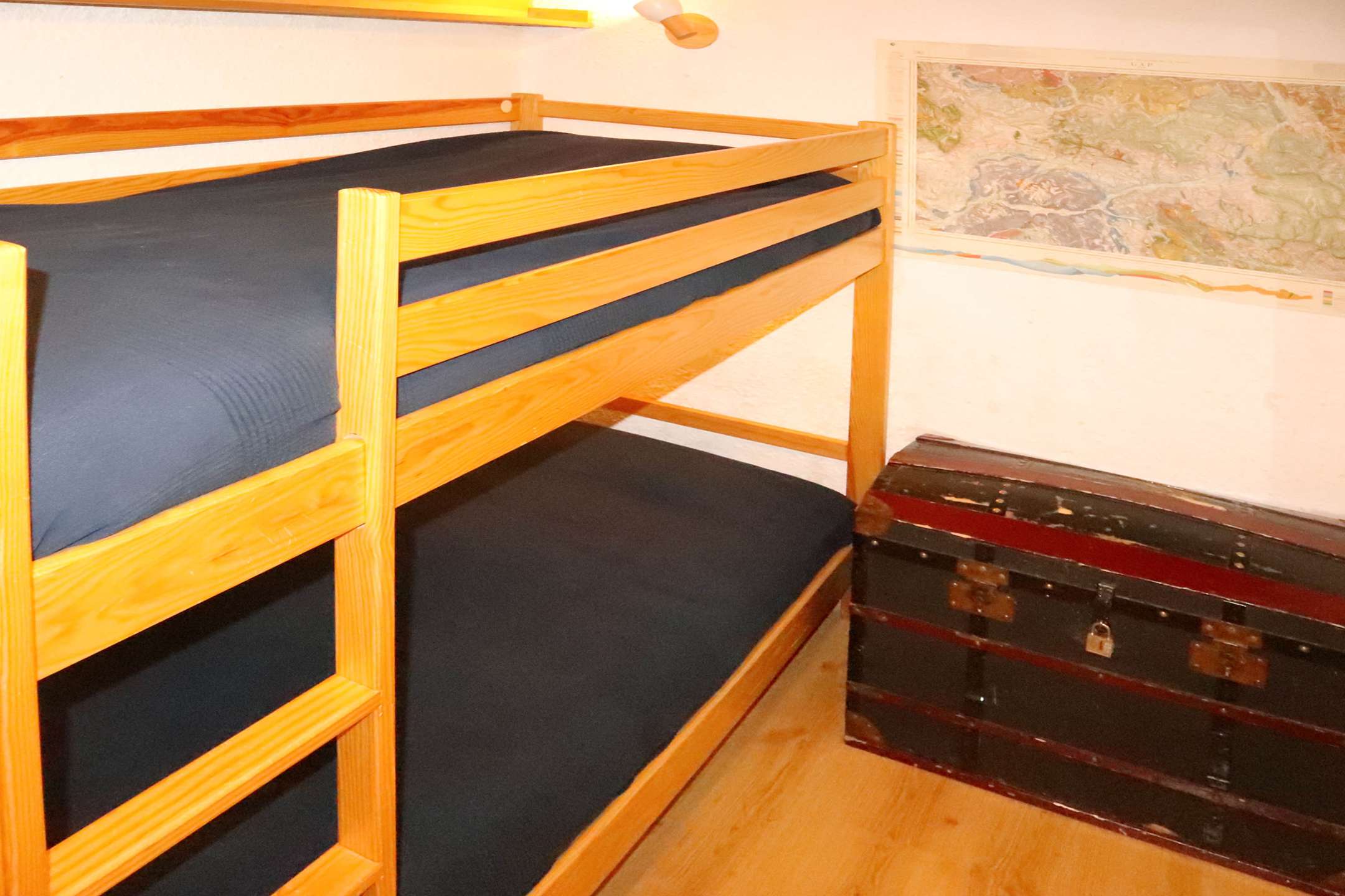 Grand appartement deux pièces pour 6 personnes au 3ème étage avec ascenseur, comprenant une entrée, un coin montagne avec 2 lits superposés 1 place, un séjour avec 2 lits gigognes 1 place, un coin cuisine ouvert sur le séjour, une chambre avec 1 lit 2 places, une salle d'eau et WC séparés. Grand balcon offrant une très belle vue sur la station exposition Sud. A proximité immédiate du centre station.