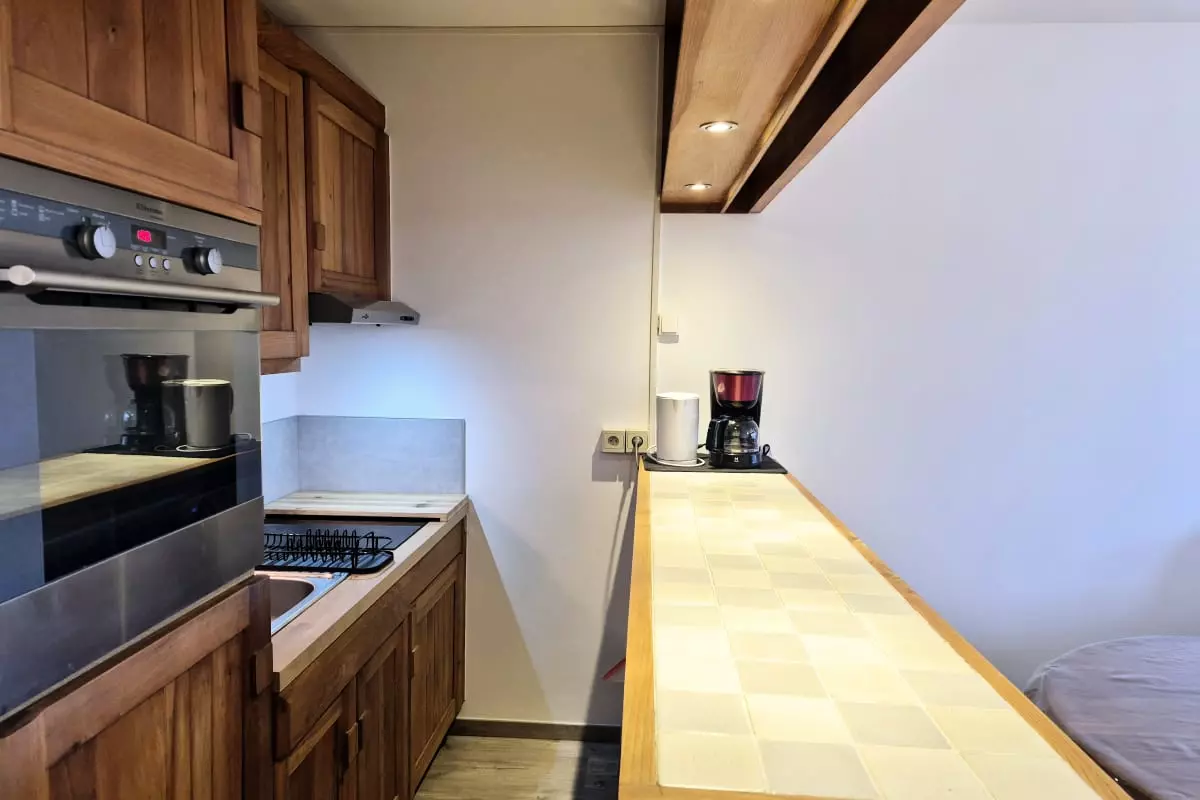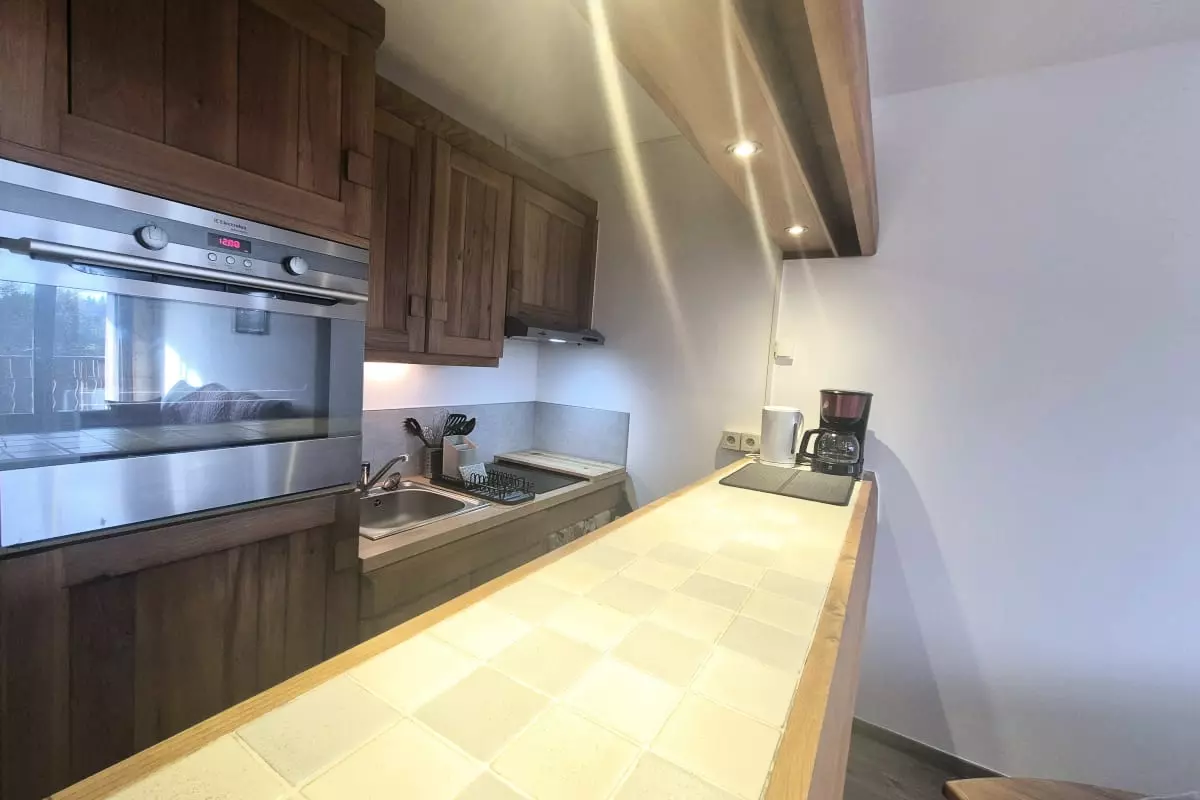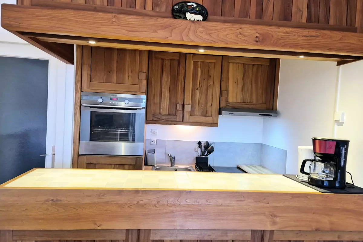 La cuisine, fonctionnelle et bien équipée, comprend : plaques de cuisson, four, micro-ondes, réfrigérateur, cafetière filtre, ainsi que toute la vaisselle et les ustensiles de base nécessaires pour cuisiner facilement.