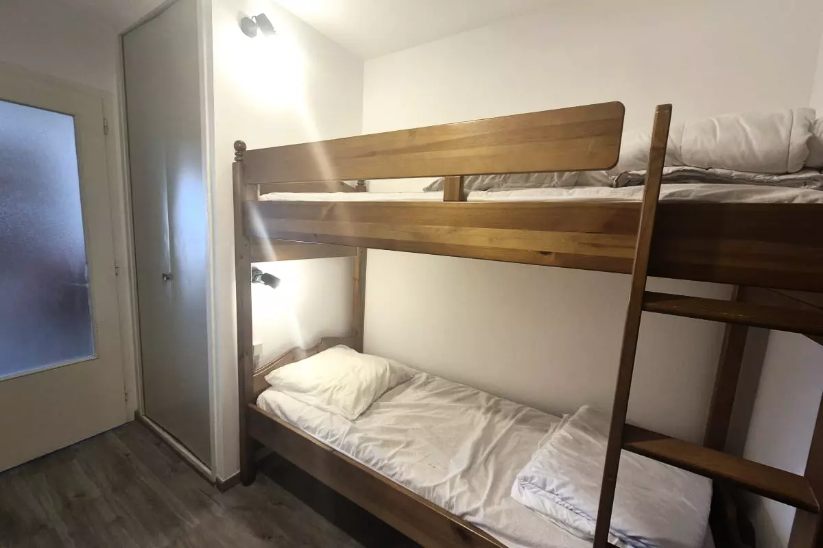 Le séjour dispose d’un **canapé-lit gigogne** pour 2 personnes, avec un matelas confortable, ainsi qu’un **coin nuit avec un lit superposé** pour 2 personnes supplémentaires.