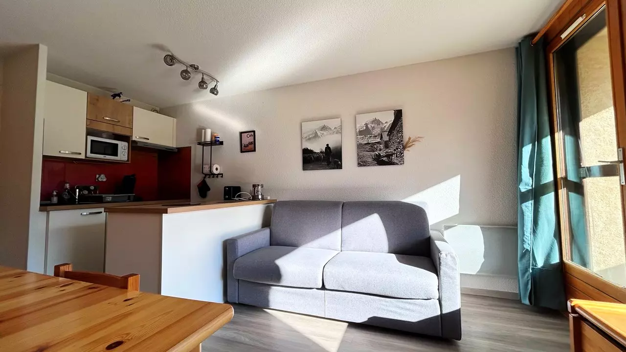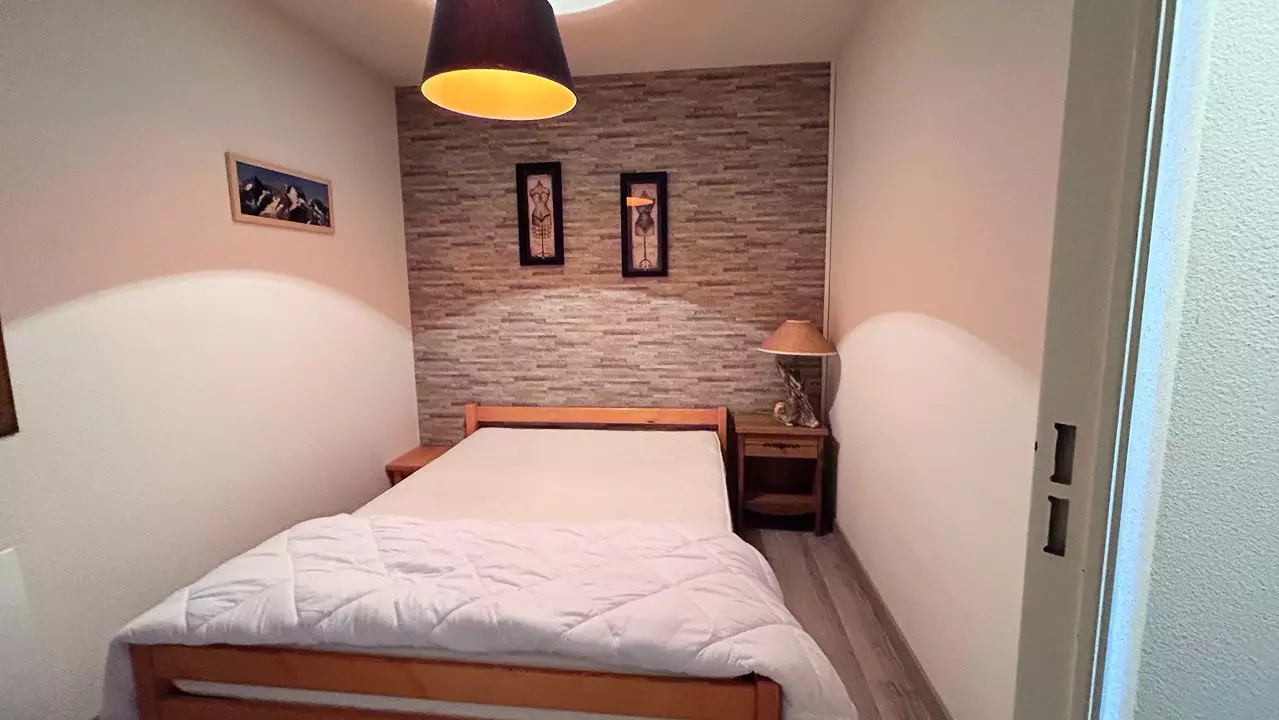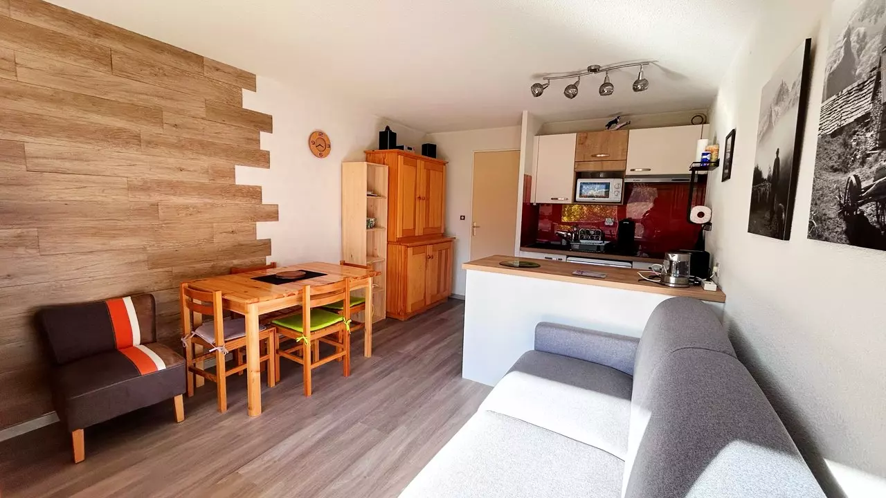 Appartement de montagne, 4 adultes et 2 enfants. Il se compose d'une entrée avec un grand placard, une chambre avec un lit double (140x200), d'un coin montagne avec un lit superposé séparé par un rideau( 90x200), une salle de bain avec baignoire et une machine à laver, un WC séparé. Le séjour avec un canapé clic clac deux places (140x200), la cuisine est équipée d'un réfrigérateur, micro-ondes , plaque vitro-céramique, lave-linge... Un agréable balcon exposée plein SUD, pour profitez d'un repas ou d'un moment détente au soleil. Un casier à ski. Un parking se situe face à la résidence.
