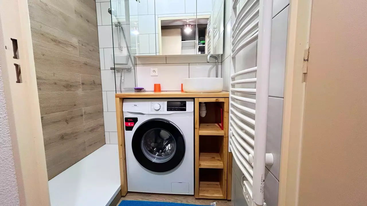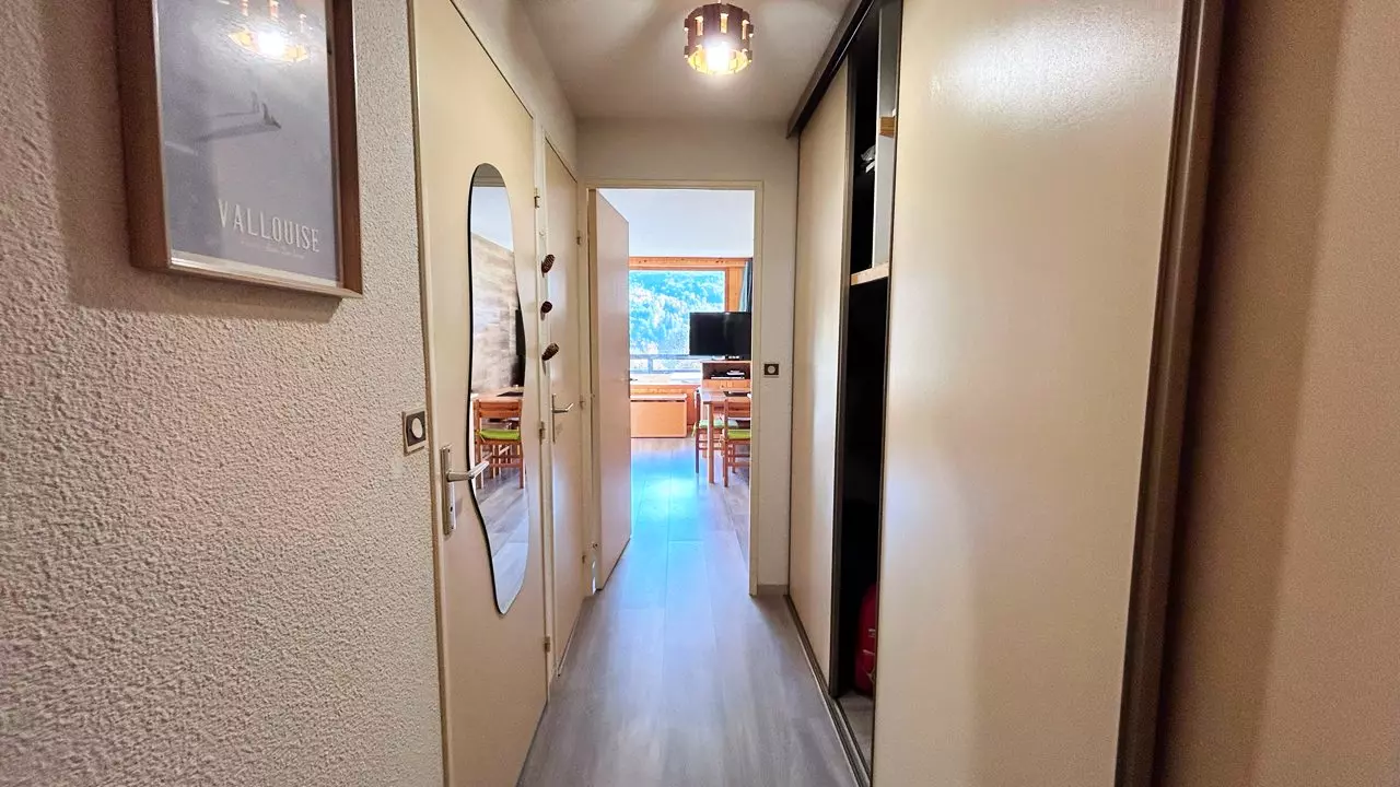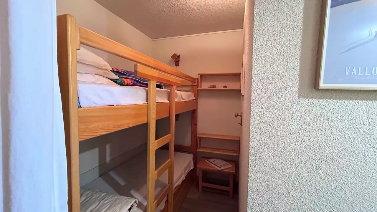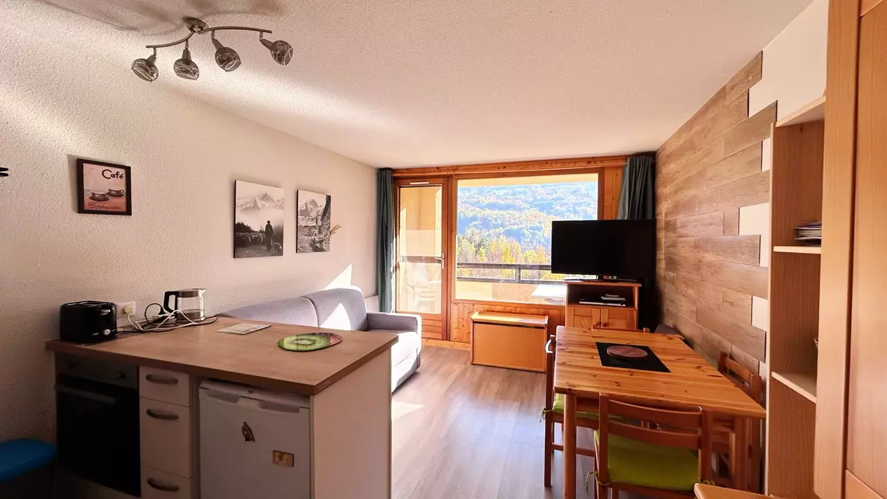 Appartement de montagne, 4 adultes et 2 enfants. Il se compose d'une entrée avec un grand placard, une chambre avec un lit double (140x200), d'un coin montagne avec un lit superposé séparé par un rideau( 90x200), une salle de bain avec baignoire et une machine à laver, un WC séparé. Le séjour avec un canapé clic clac deux places (140x200), la cuisine est équipée d'un réfrigérateur, micro-ondes , plaque vitro-céramique, lave-linge... Un agréable balcon exposée plein SUD, pour profitez d'un repas ou d'un moment détente au soleil. Un casier à ski. Un parking se situe face à la résidence.