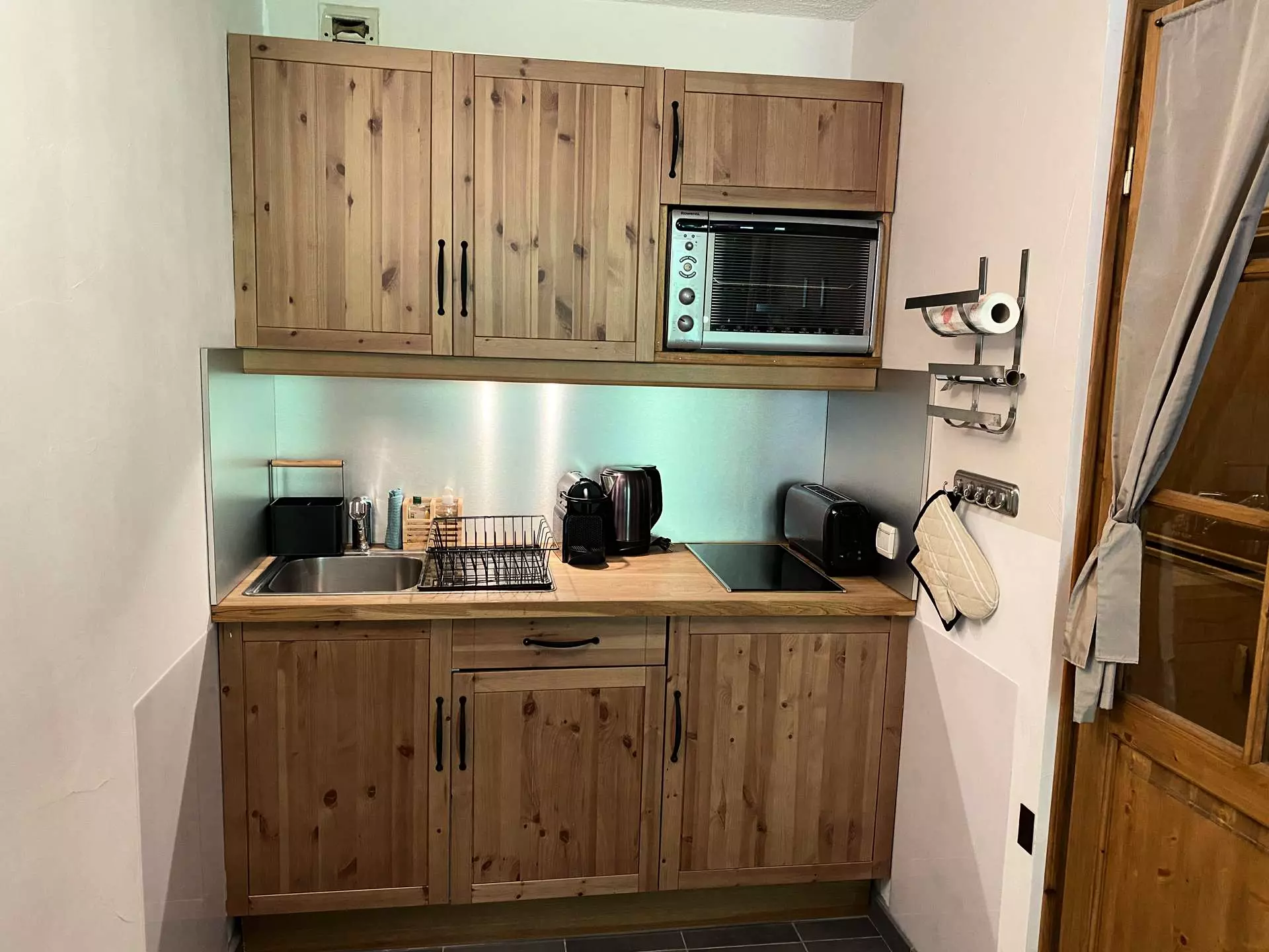 L'appartement dispose d'un séjour avec un canapé d'angle modulable en lit double, une cuisine ouverte, une chambre avec un lit double, un couloir avec deux lits wagons, une salle de bain moderne, WC séparé et une terrasse avec vue sur la piste et les montagnes.
