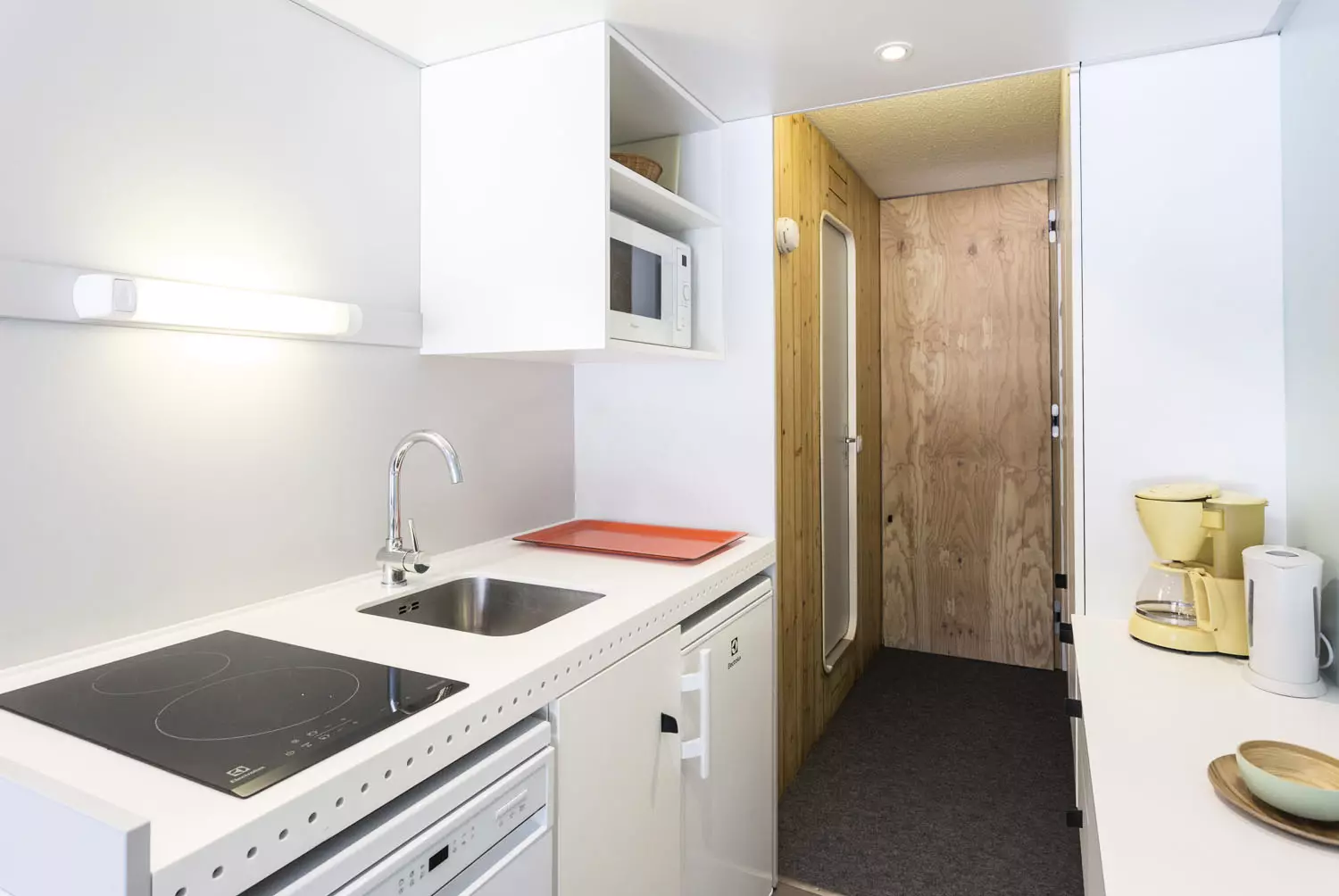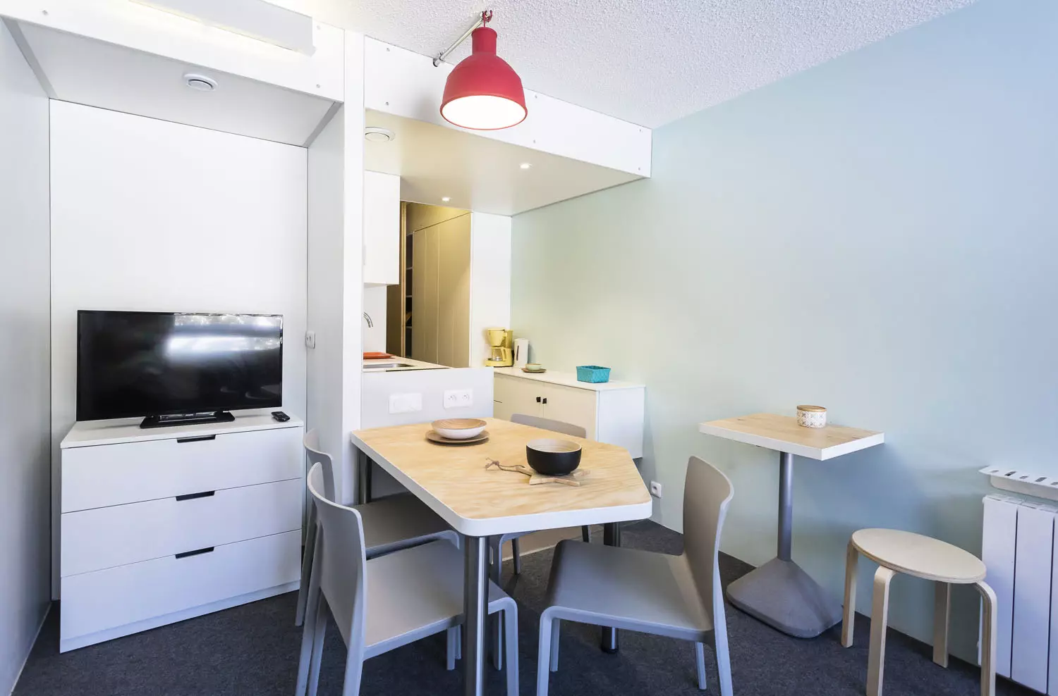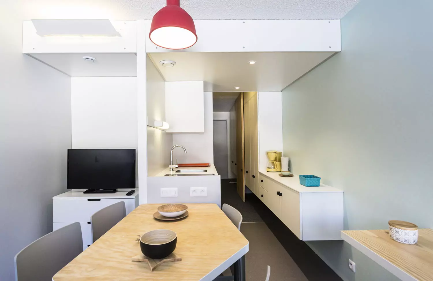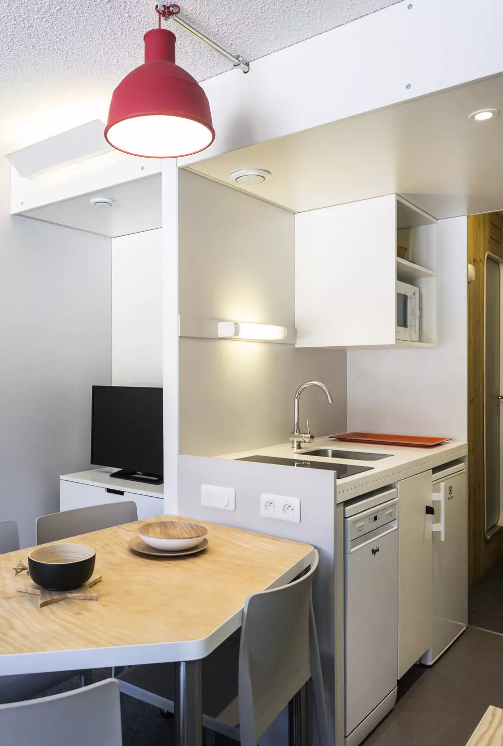 Kichenette comprenant : 2 plaques vitrocéramique, four combiné (grill+micro-ondes), réfrigérateur, lave vaisselle, bouilloire, cafetière électrique à filtre, et grille pain.