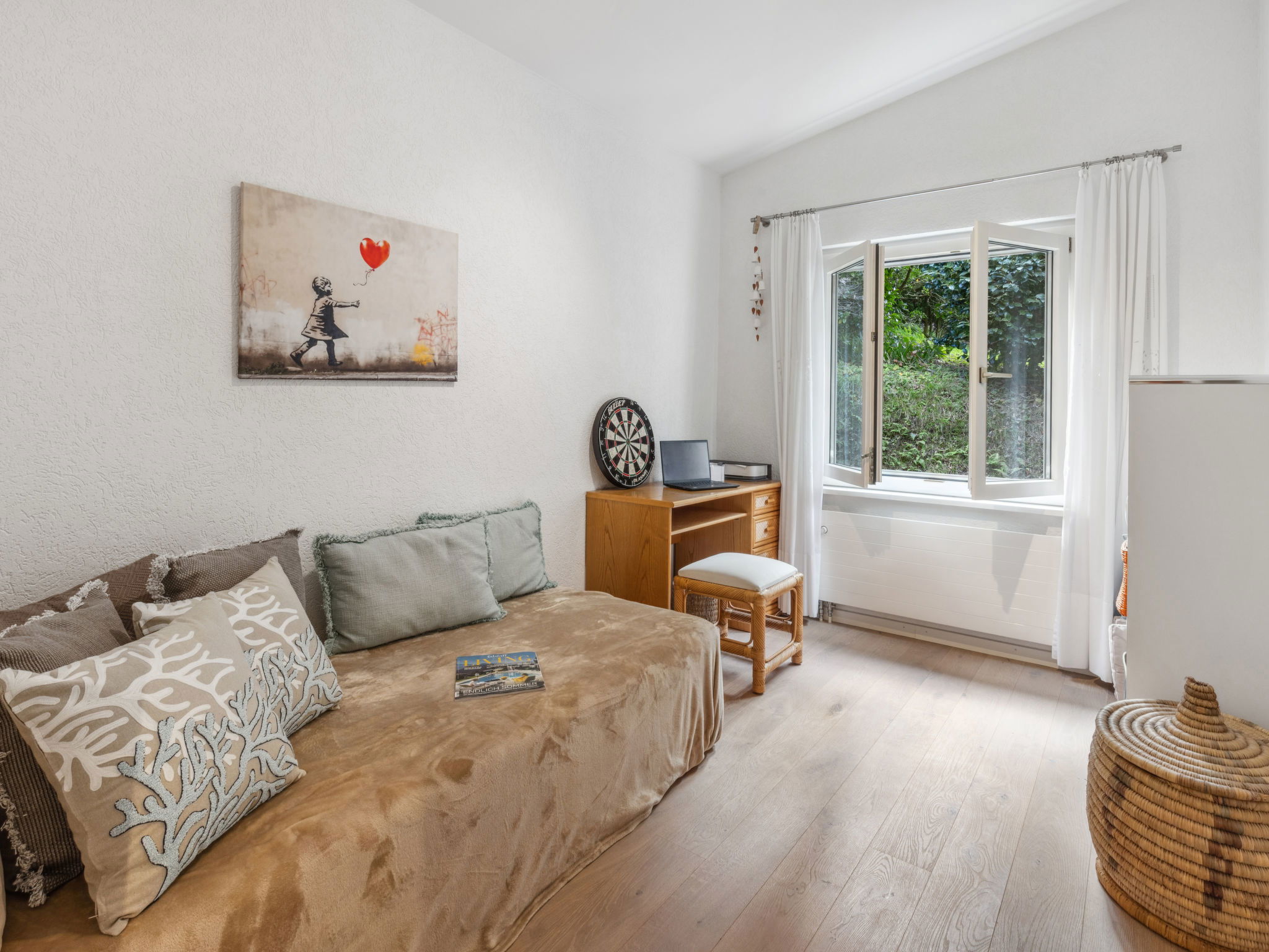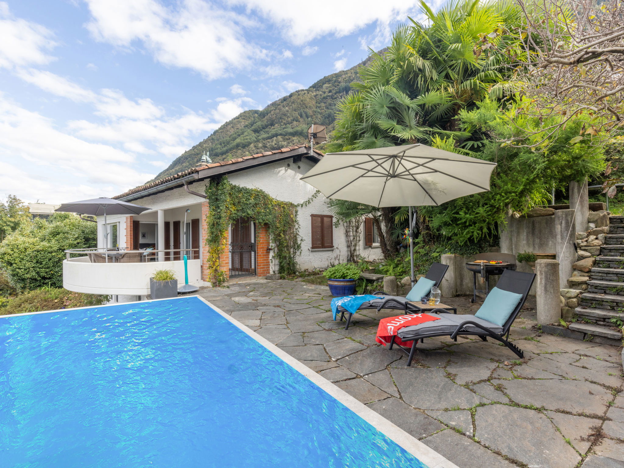 Magadino à 15 km de Locarno: Belle maison individuelle confortable "Villetta Felice mit Pool", 230 m au dessus du niveau de la mer, de 2 étages, année de construction 1965, rénovée en 2023. Dans le haut de la station de Magadino, situation tranquille, ensoleillée, surélevée, orientée nord-ouest. A usage privé: grand, beau jardin 200 m2 (clôturé), piscine rectangulaire (7 x 3 m, profondeur 150 cm, disponibilité saisonnière: 01.Mai. - 15.Oct.) avec protection par couverture de volet et systeme d'électolyseur au sel. Douche extérieure. Infrastructures de la Maison: chauffage central. Sentier en escalier (6 marches) jusqu'à la maison. Magasin d'alimentation 800 m, supermarché 6 km, restaurant 800 m, arrêt de bus "Orgnana, Monda" 80 m, gare ferroviaire "Bellinzona" 19 km. Port plaisance 1.5 km, terrain de golf (18 trous) 19 km, golf miniature 2.2 km, chemins de randonnées pédestres depuis la maison 10 m. Attractions à proximité: Mercato Luino IT, Parco botanico del Gambarogno, Castelli di Bellinzona. Les lacs connus sont facilement accessibles: Lago Maggiore. Région de randonnées: Bolle di Magadino, Valle Verzasca, Vallemaggia. Le propriétaire n'accepte pas les groupes de jeunes.