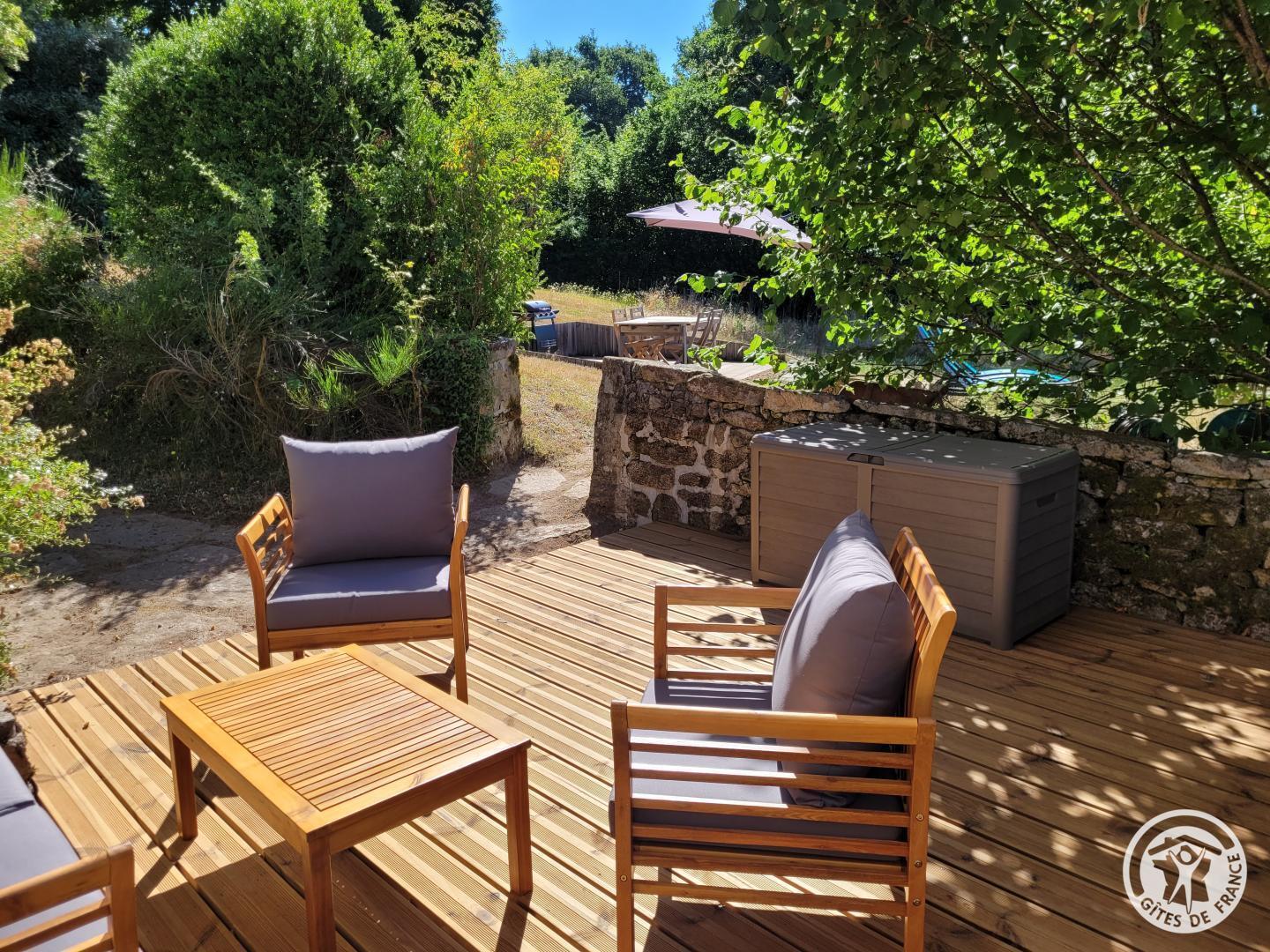 Terrain partiellement clôturé. Terrasse bois avec petit salon de jardin, Table extérieure, Parasol, transats et barbecue à disposition.