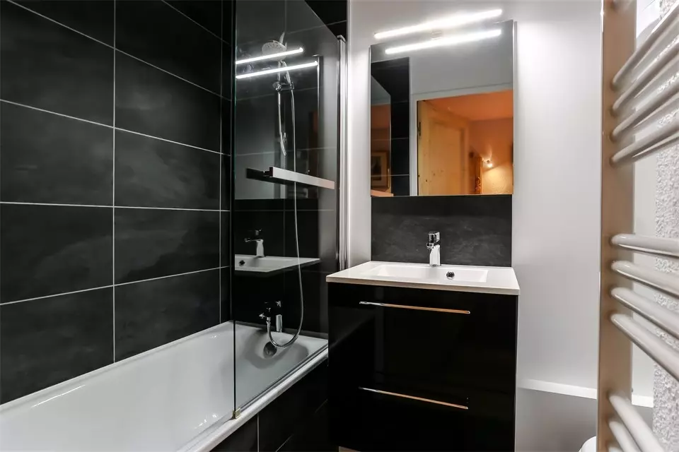 - Une salle de bain avec baignoire, lavabo, sèche-serviettes et WC.