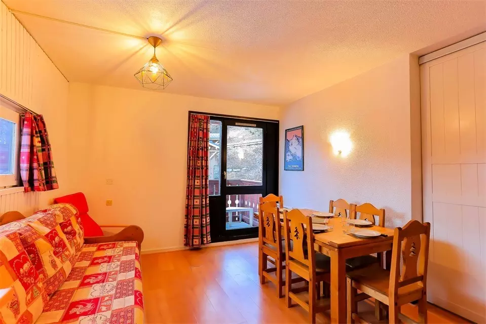 - Séjour équipé d’une banquette gigogne (soit 2 couchages), d’une TV avec lecteur DVD et d'un coin repas avec 5 places assises.