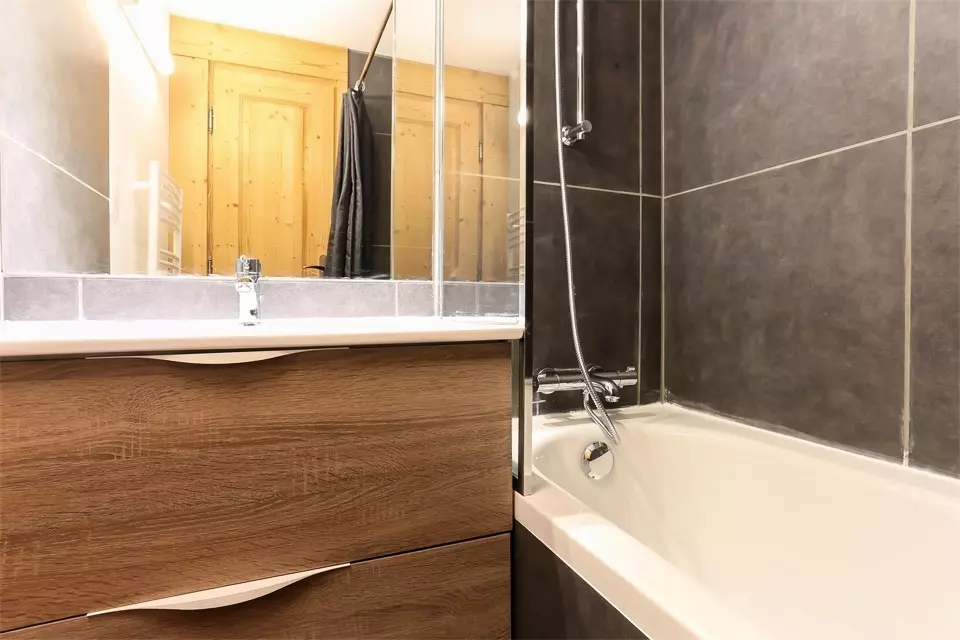- La salle de bain est équipée d'une baignoire avec robinetterie thermostatique, d'un sèche-serviettes et d'un sèche-cheveux. Les WC sont séparés.