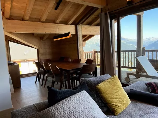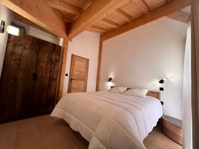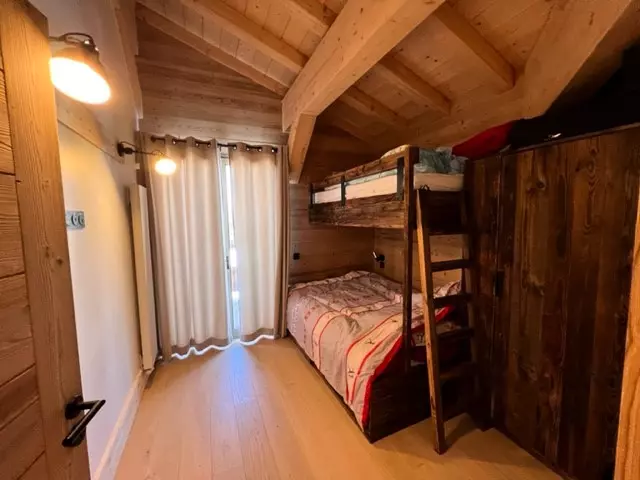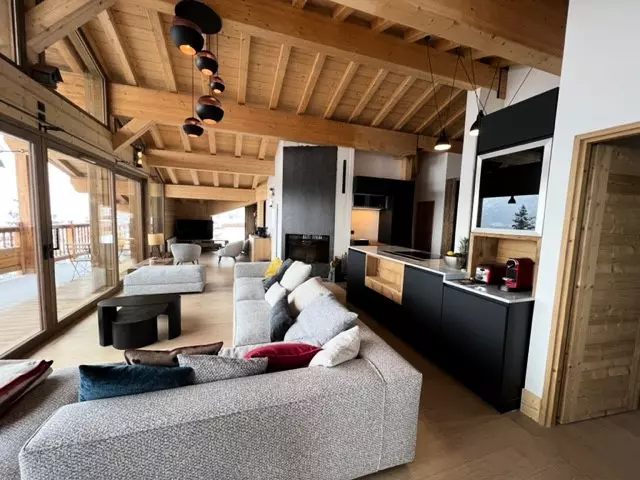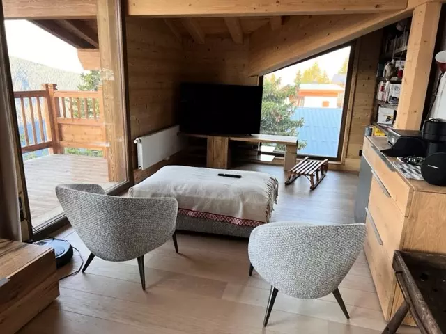 L’appartement possède un espace de vie généreux de 53m2 avec un plafond cathédral, un balcon terrasse exposé plein sud surplombant le parc de la Vanoise. Idéal pour se retrouver en famille ou entre amis.