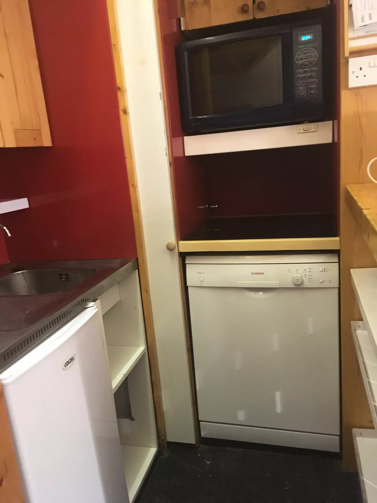 Kitchenette comprenant : plaques vitrocéramique, four combiné (grill + micro-ondes), lave vaisselle, réfrigérateur, bouilloire, cafetière électrique à filtre, et toaster