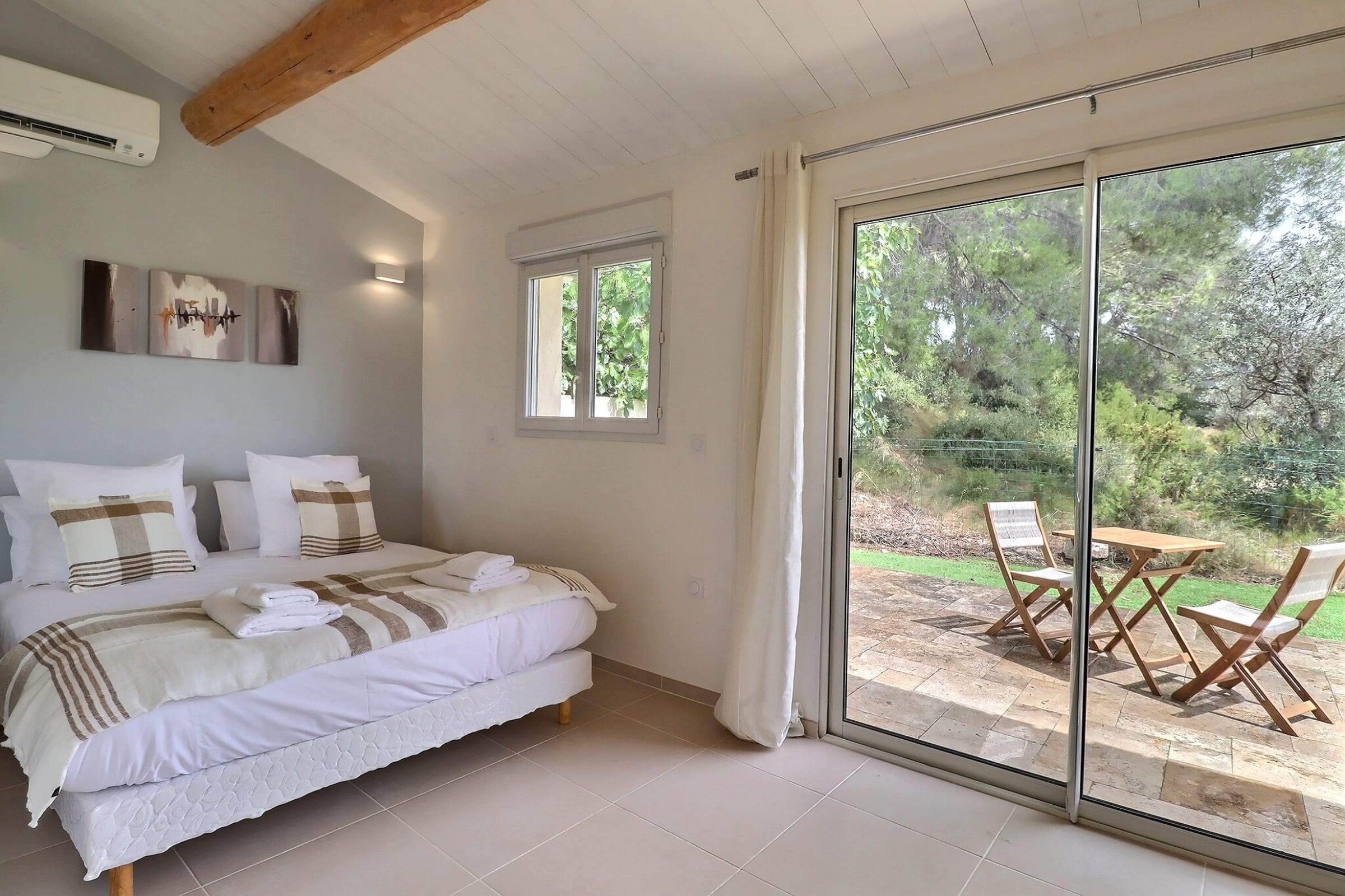 L’ensemble de la maison, y compris la dépendance, est entièrement climatisé. À l’extérieur, un terrain de pétanque permet de prolonger les journées d’été dans une ambiance conviviale.