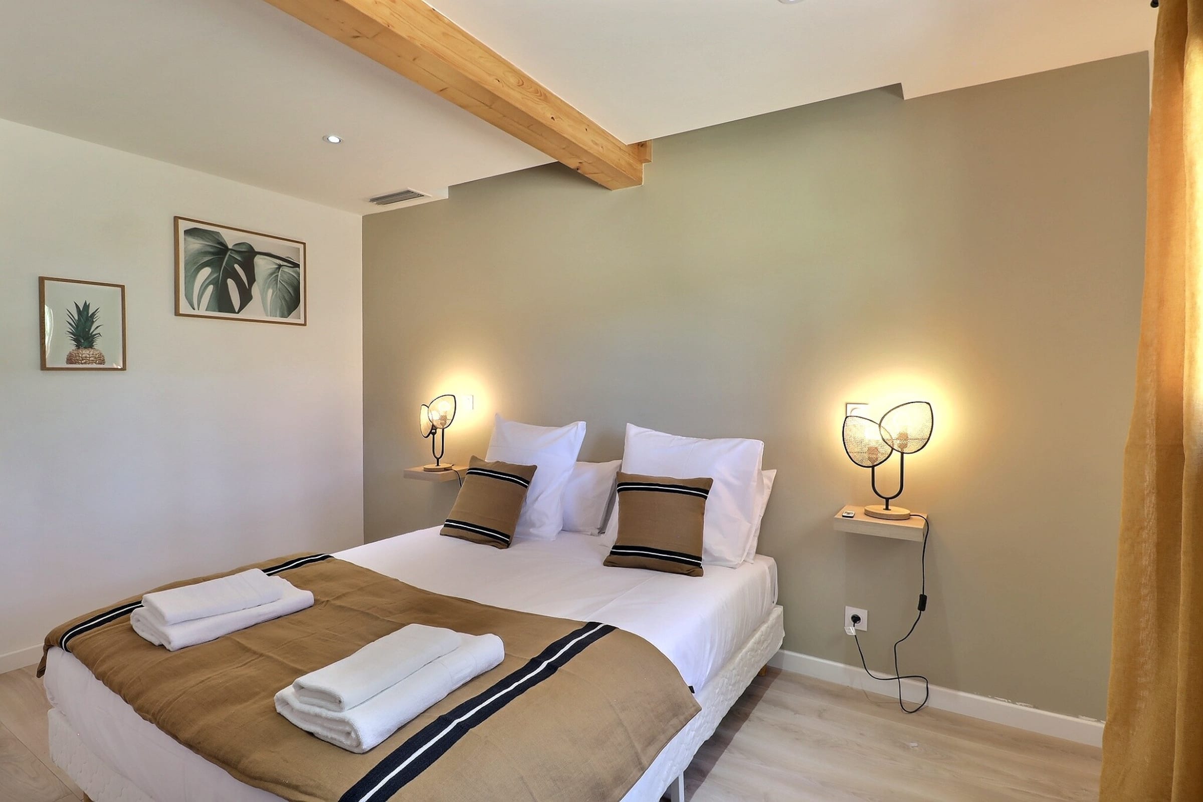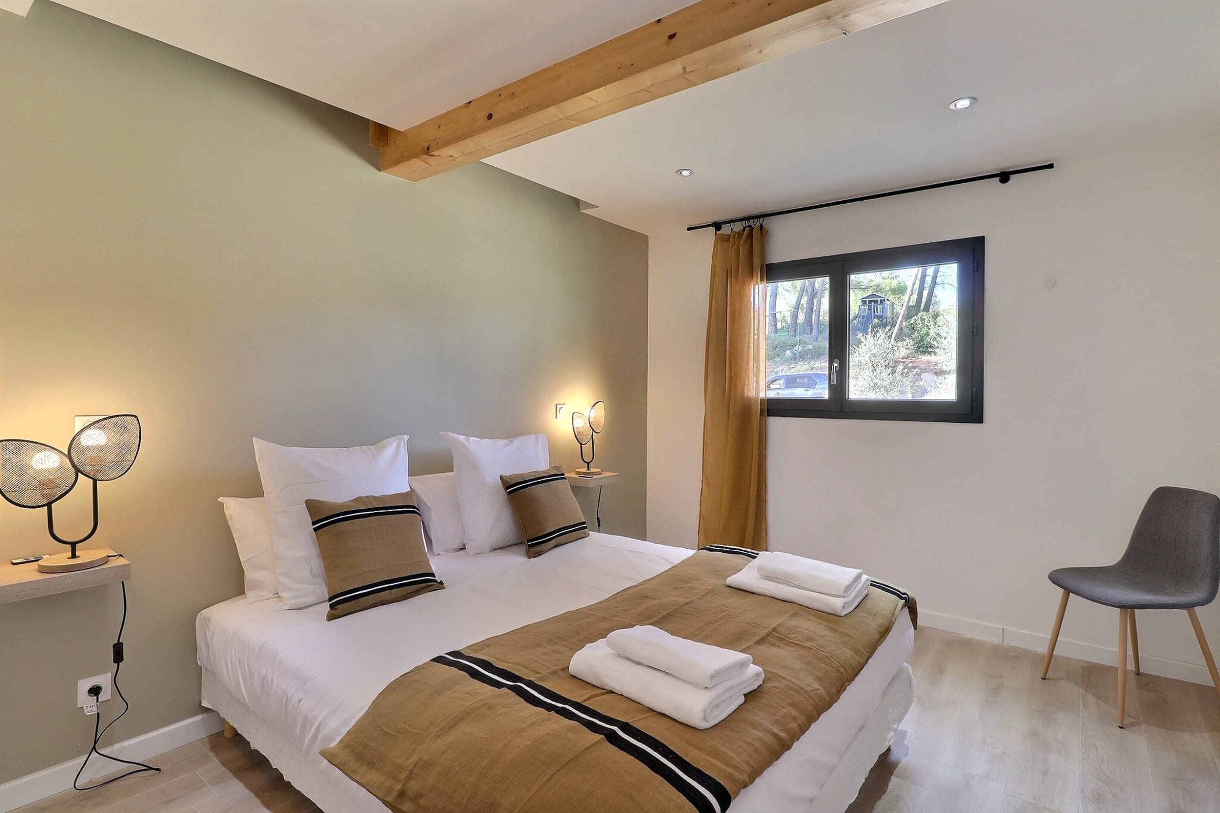 La villa se compose de cinq chambres, dont une dépendance indépendante aménagée en véritable suite privée, avec sa propre salle d’eau et une terrasse intime, parfaite pour garantir autonomie et tranquillité à ses occupants. Située en léger contrebas, cette dépendance est proche d’une petite route où circulent quelques véhicules, ce qui peut occasionner une légère nuisance sonore à certains moments de la journée.