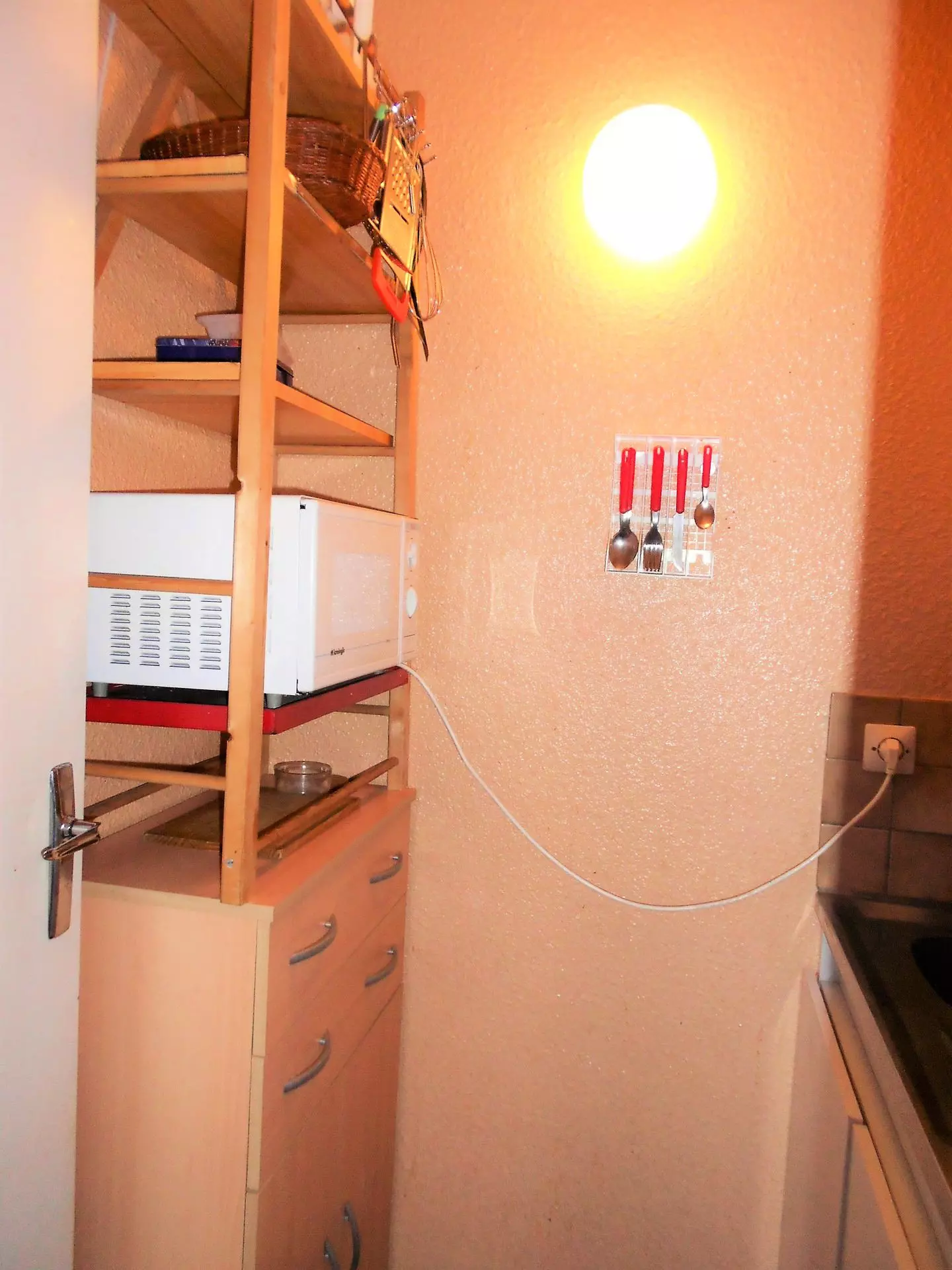 Le coin cuisine séparé par une porte coulissante du séjour, est équipé de plaques électriques, d'un réfrigérateur, d'un micro-ondes, un grille-pain, cafetière électrique,...