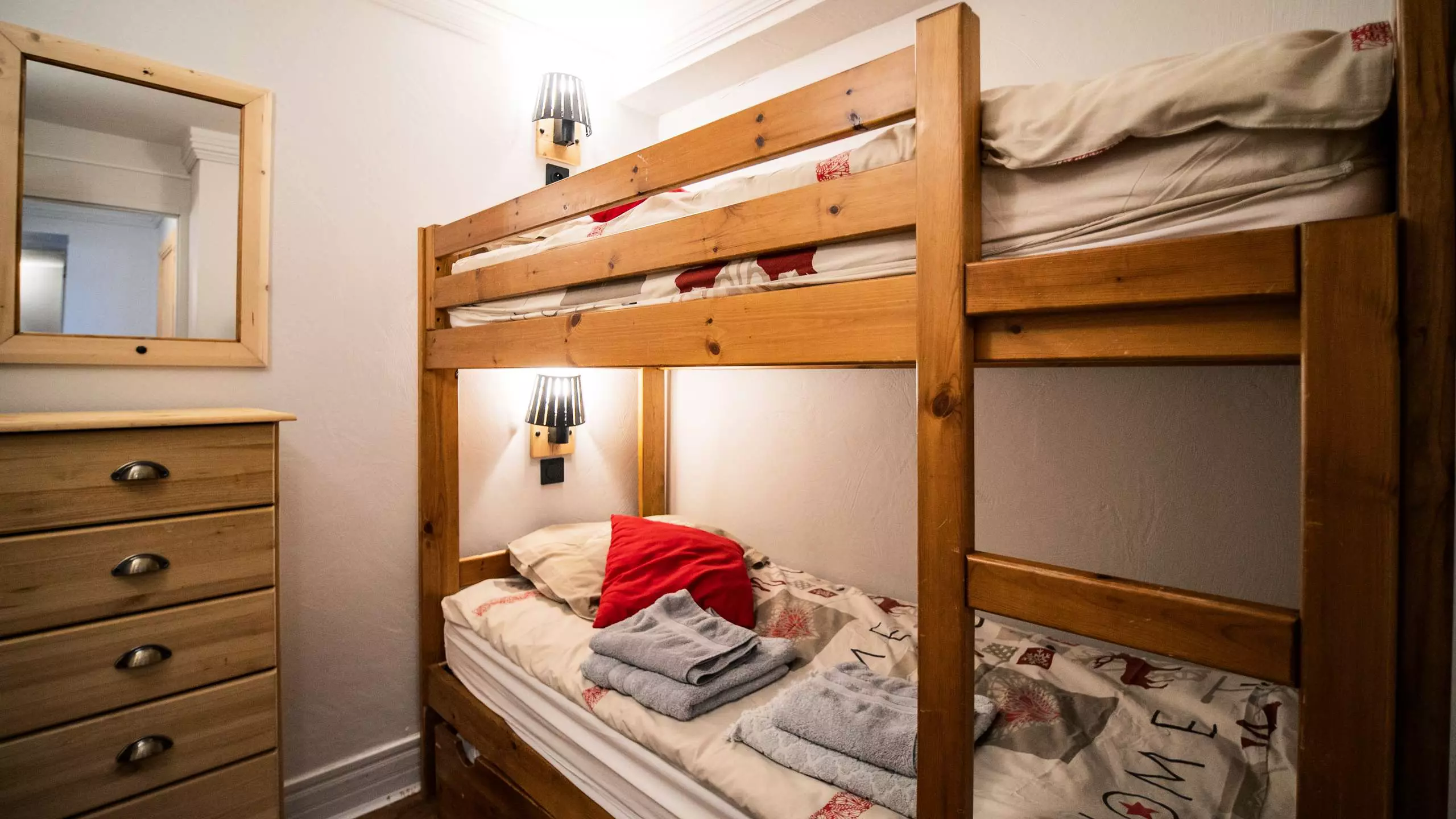 - 2 chambres avec 1 lit double et 1 cabine avec des lits superposés. Equipées de couettes.