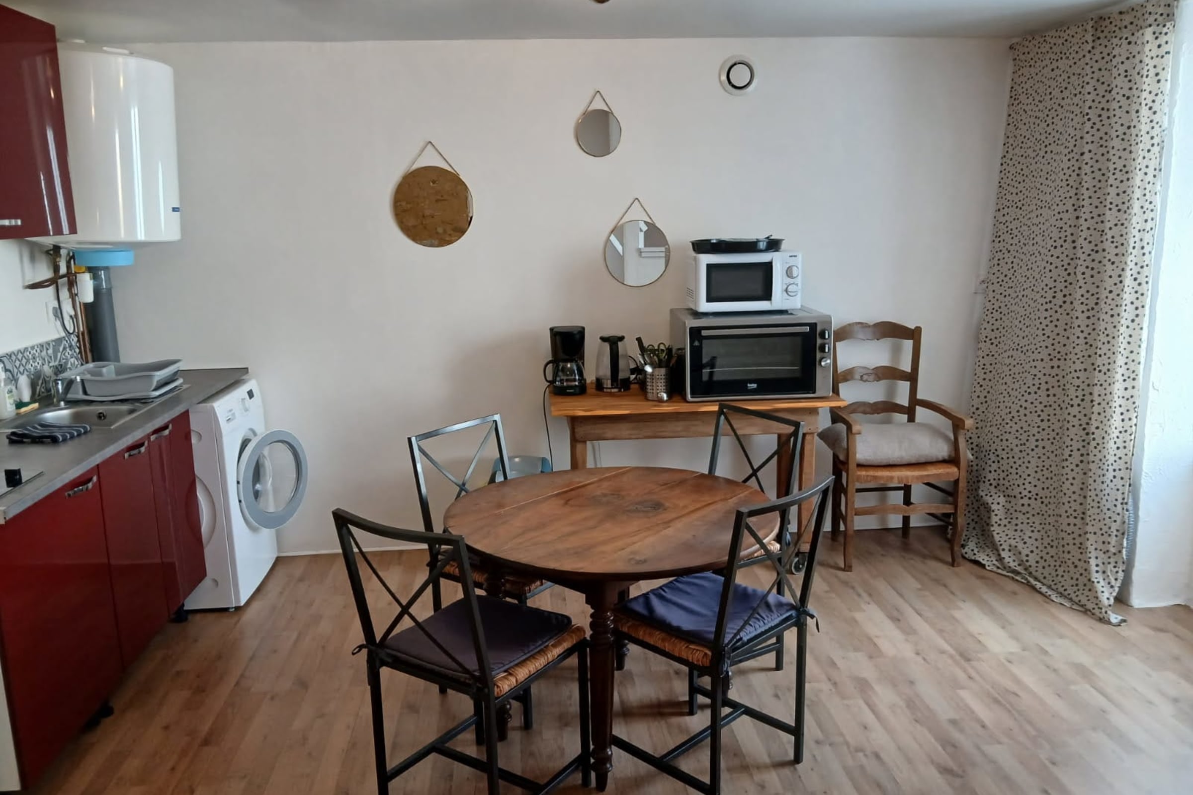 Rez‑de‑chaussée : cuisine ouverte sur salon / salle à manger avec canapé convertible (linge de lit, couette, draps et serviettes fournis).