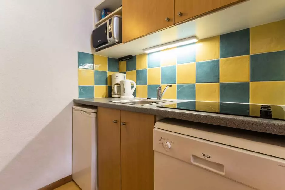 Un coin cuisine avec vitro céramique, micro ondes, réfrigérateur, lave vaisselle, cafetière.