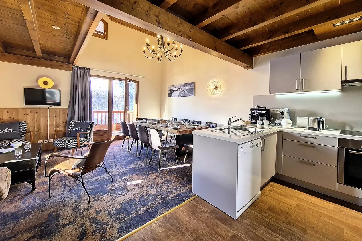 Cuisine ouverte équipée de 4 plaques induction, réfrigérateur, four, micro-ondes, lave-vaisselle.