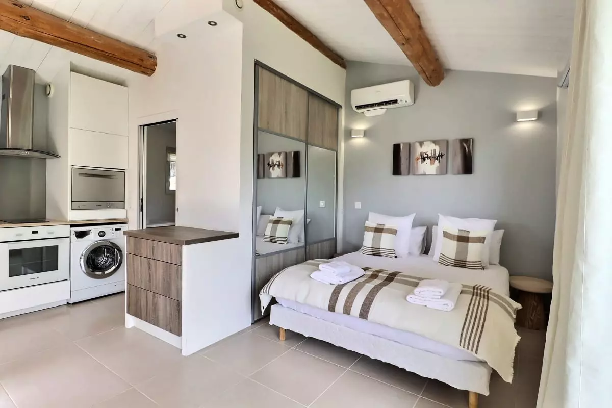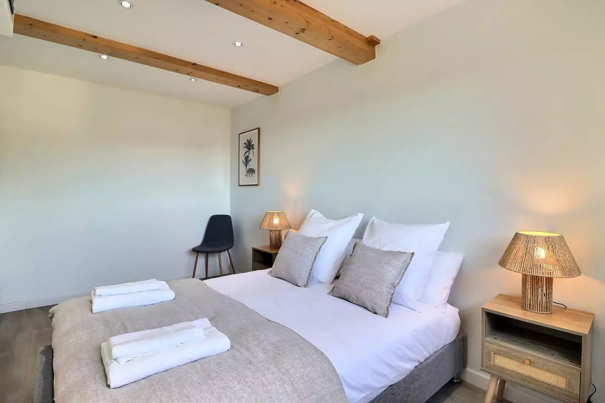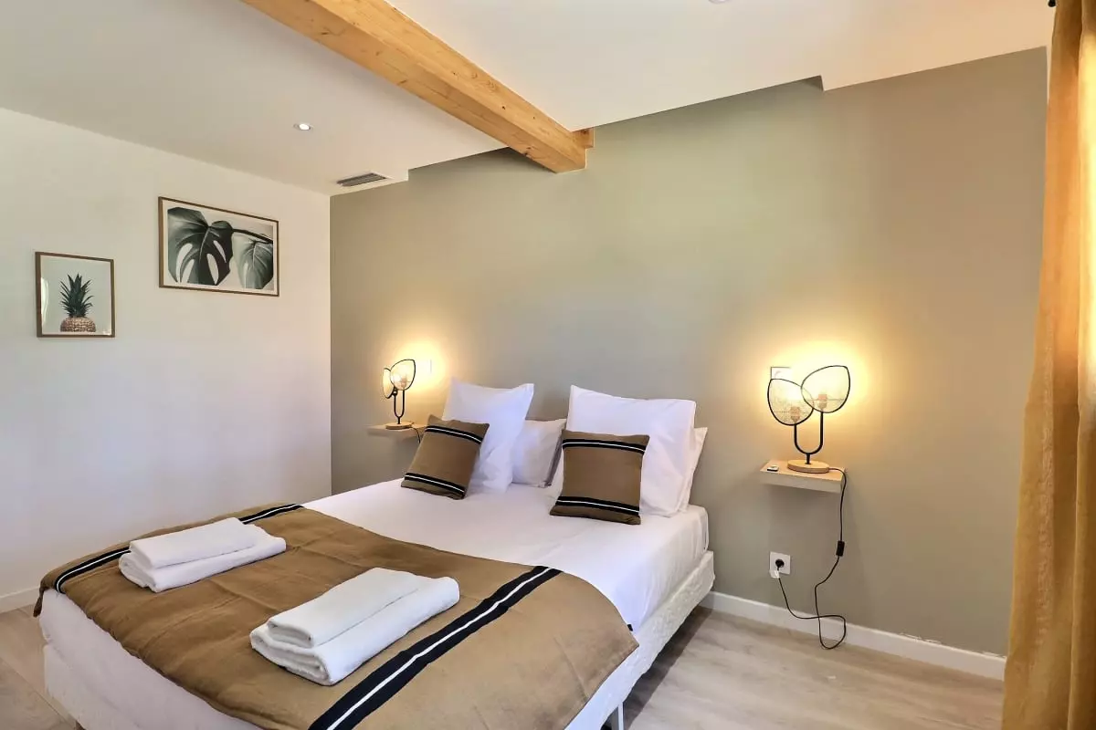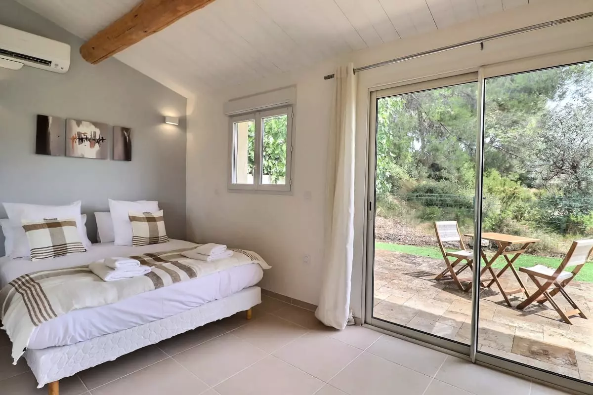 La villa se compose de cinq chambres, dont une dépendance indépendante aménagée en véritable suite privée, avec sa propre salle d’eau et une terrasse intime, parfaite pour garantir autonomie et tranquillité à ses occupants. Située en léger contrebas, cette dépendance est proche d’une petite route où circulent quelques véhicules, ce qui peut occasionner une légère nuisance sonore à certains moments de la journée.