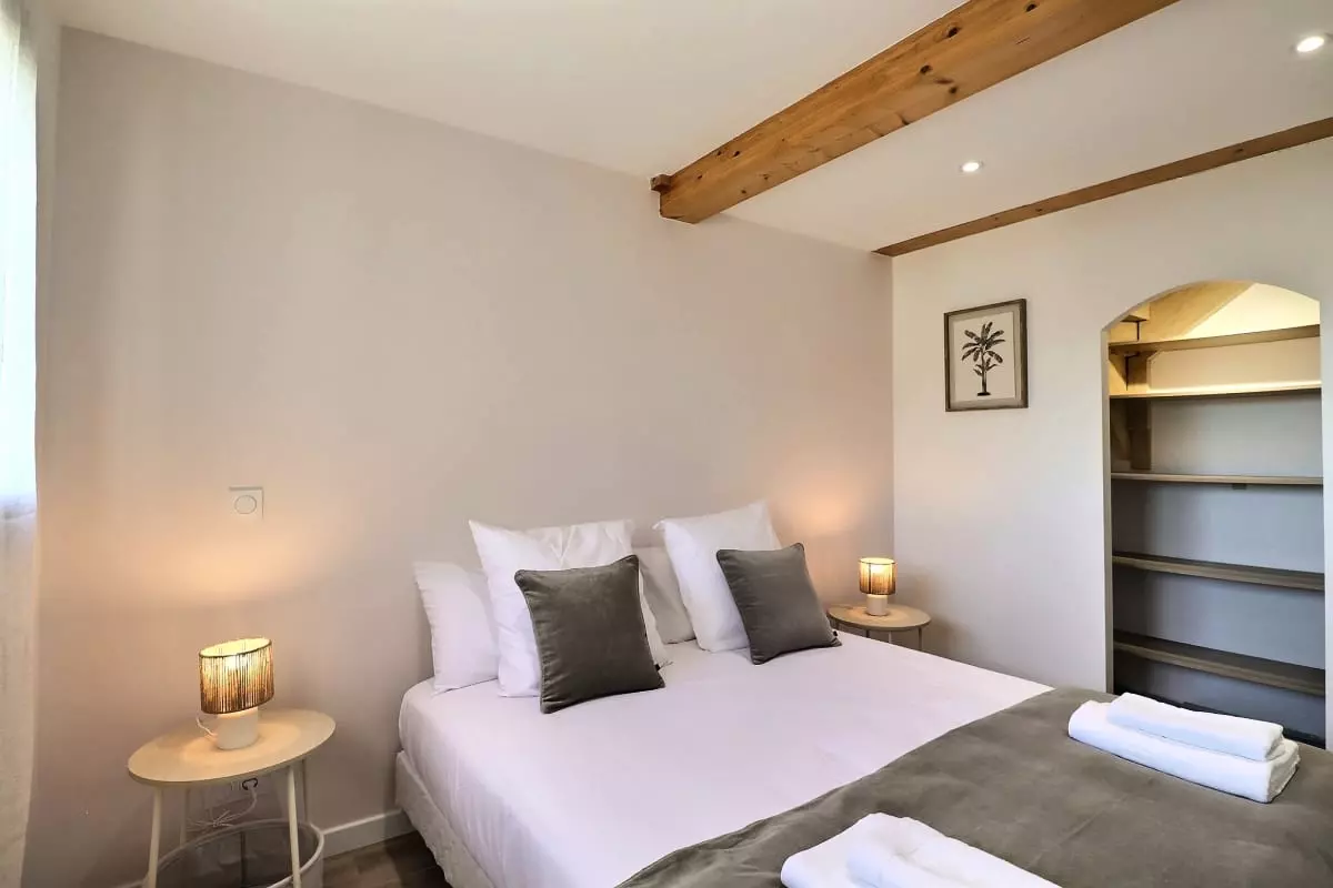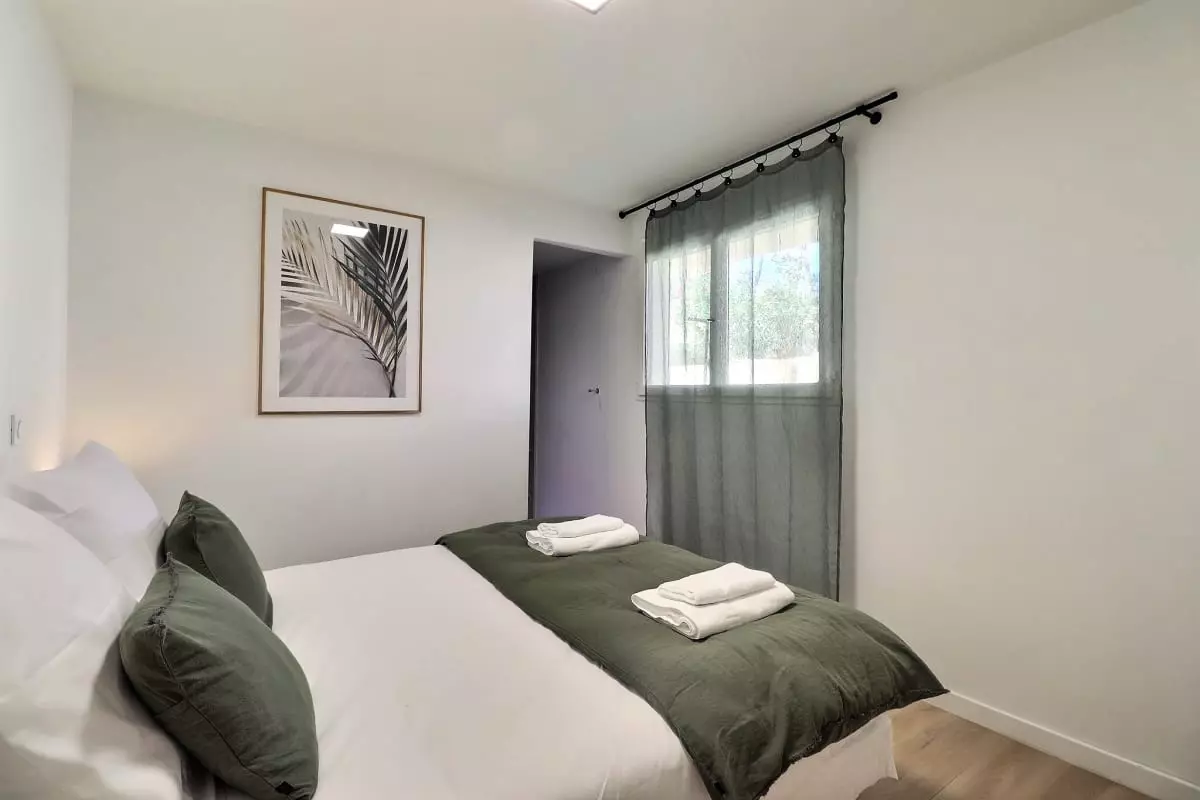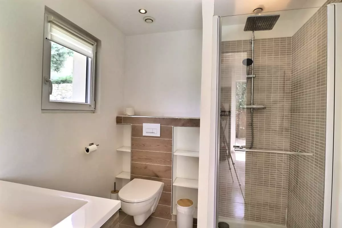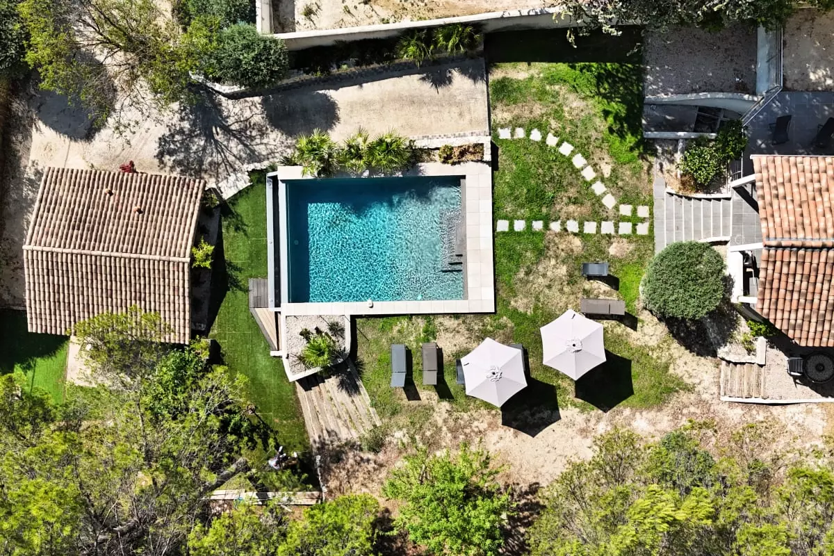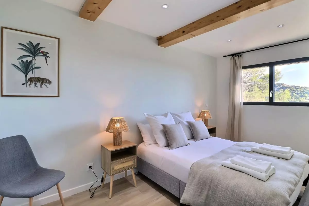 La villa se compose de cinq chambres, dont une dépendance indépendante aménagée en véritable suite privée, avec sa propre salle d’eau et une terrasse intime, parfaite pour garantir autonomie et tranquillité à ses occupants. Située en léger contrebas, cette dépendance est proche d’une petite route où circulent quelques véhicules, ce qui peut occasionner une légère nuisance sonore à certains moments de la journée.