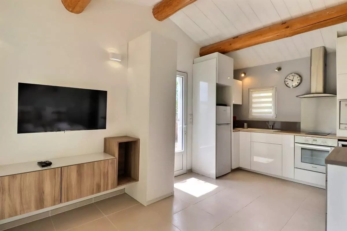 Dans la maison principale, le salon lumineux, la cuisine ouverte entièrement équipée et l’espace repas forment un vaste espace de vie convivial, tourné vers le jardin et la piscine à débordement. L’ensemble bénéficie d’une belle lumière naturelle grâce aux grandes ouvertures sur l’extérieur.