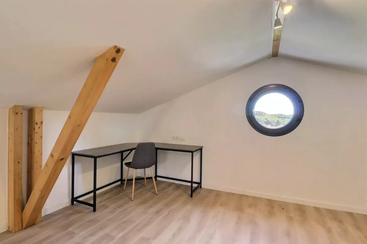 Au rez-de-chaussée, une première chambre dispose d’un grand dressing et jouxte une salle d’eau moderne. L’étage accueille trois autres chambres, une salle de bain spacieuse avec baignoire et douche, ainsi qu’un dernier niveau aménagé en espace bureau, idéal pour télétravailler dans le calme.