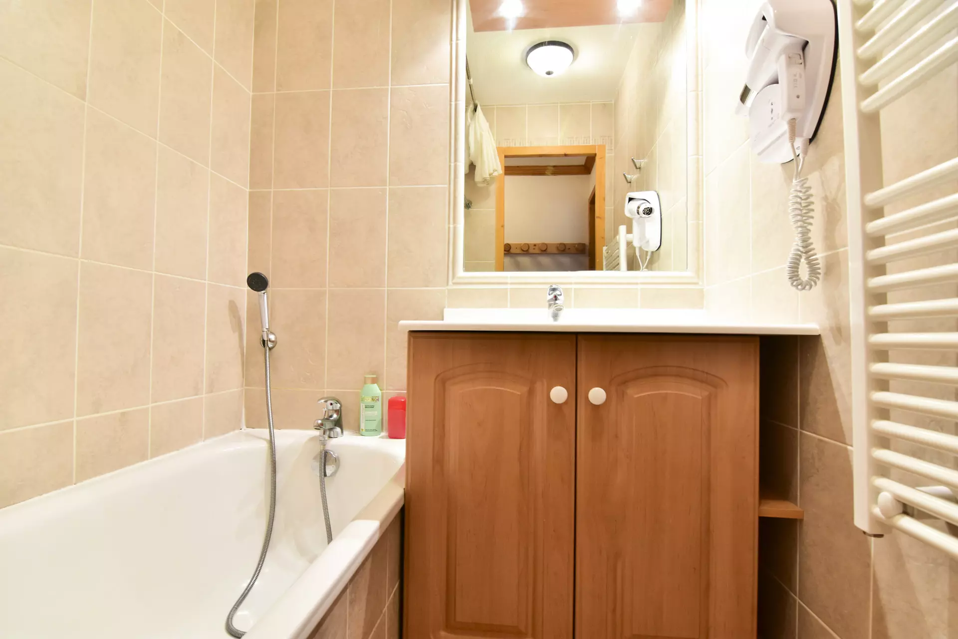 Salle de bains : lavabo, baignoire et sèche-cheveux.