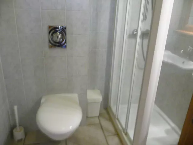 Salle d'eau : lavabo, douche et WC.