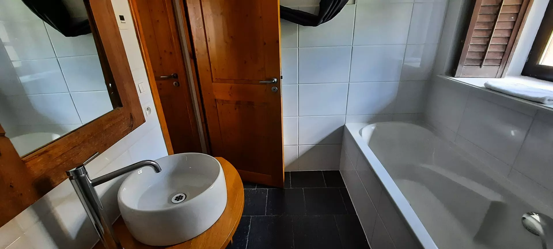 Salle de bains : lavabo, baignoire, sèche-cheveux, lave-linge, sèche-linge et WC.