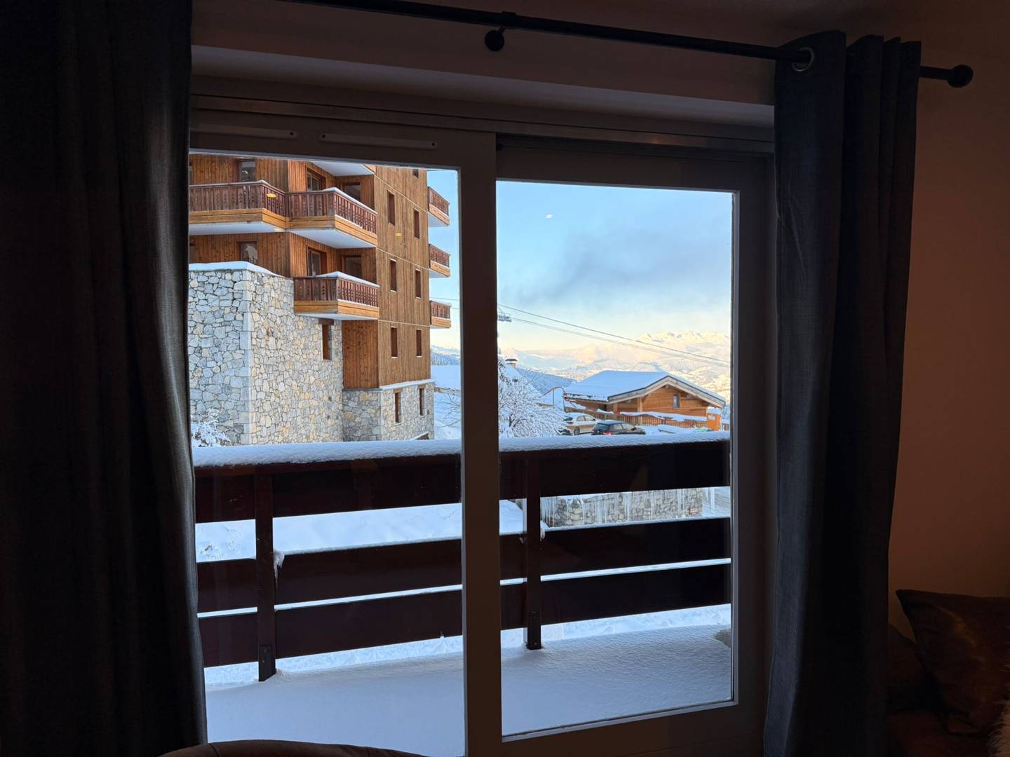 Le séjour en angle, sans couchage, profite de grandes ouvertures donnant sur deux larges balcons, offrant une impression d’espace et de clarté rare à la montagne.