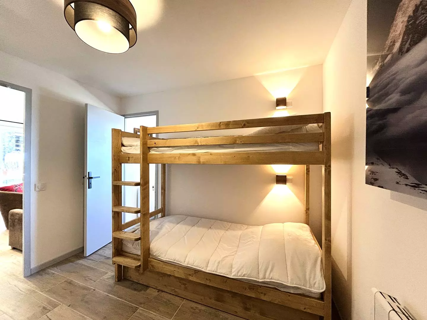 Côté nuit, la chambre principale dispose d’un lit coffre double (140×190) et d’une armoire, offrant de larges possibilités de rangement. Le coin montagne, aménagé dans le prolongement de l’entrée, peut être totalement fermé du séjour pour plus d’intimité. Il accueille trois couchages (lits superposés et lit tiroir – 3 lits simples 80×190), constituant ainsi une seconde chambre à part entière.