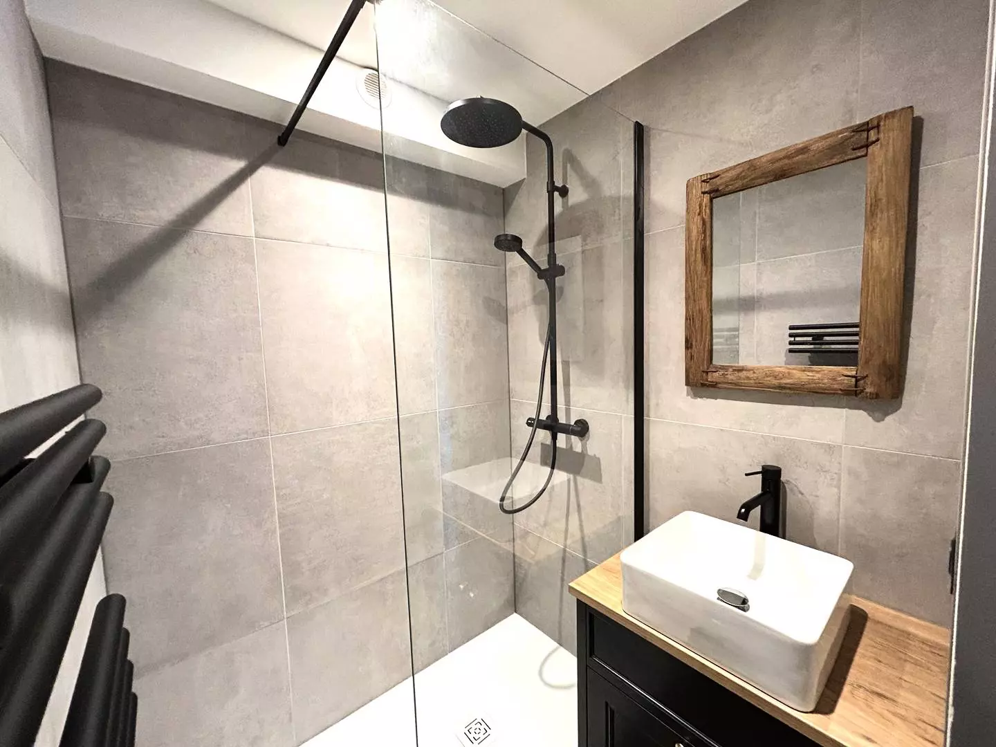 Un vaste hall d’entrée équipé d’un grand placard facilite le rangement du matériel de ski. La salle d’eau, élégante et contemporaine, comprend une douche à l’italienne, tandis que les WC indépendants sont dotés d’un lave-linge 3 kg pour encore plus de praticité.