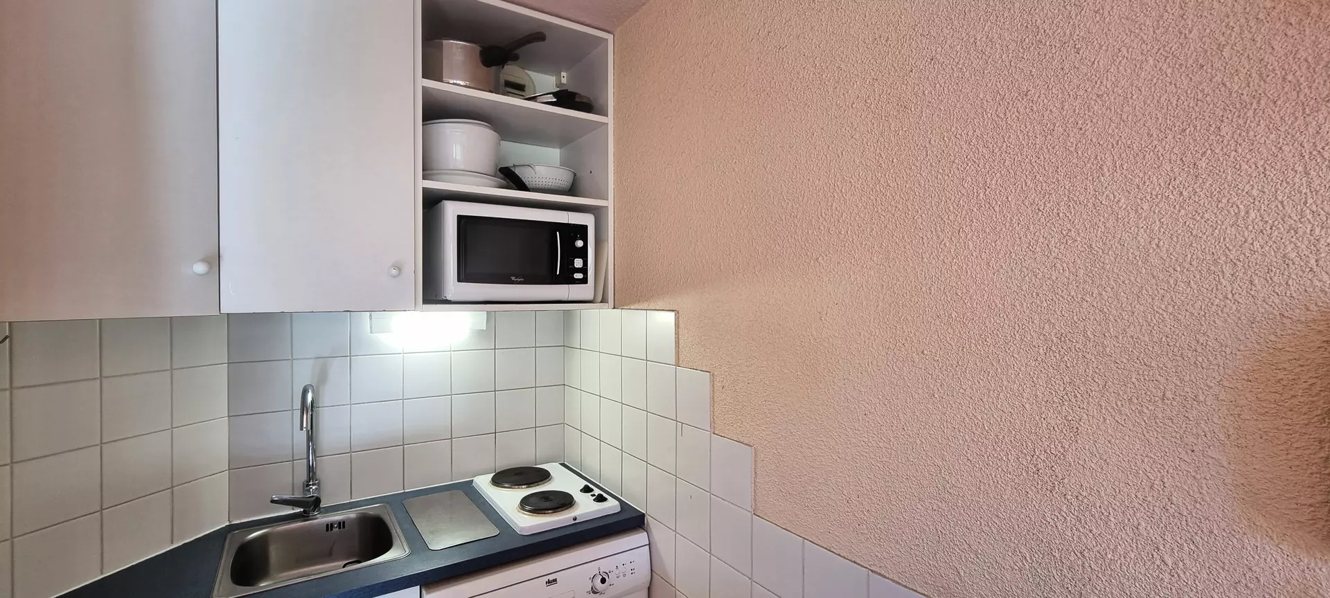 La cuisine, ouverte sur le séjour, est équipée d'un micro-ondes, de 2 plaques électriques, d'un réfrigérateur top et d'un lave vaisselle.