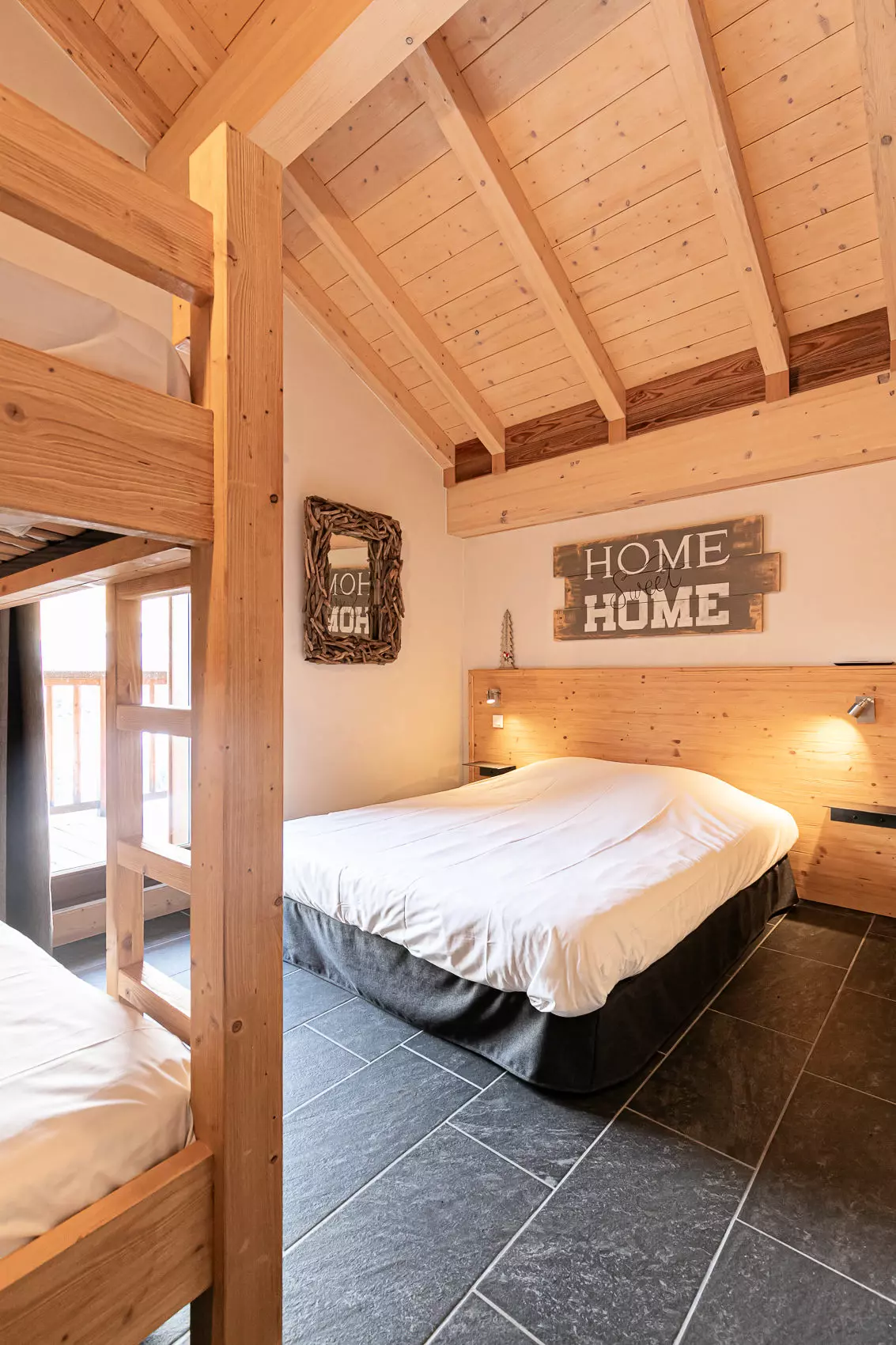 1 chambre avec lit double (160 cm) et lits superposés (90cm) à l’étage