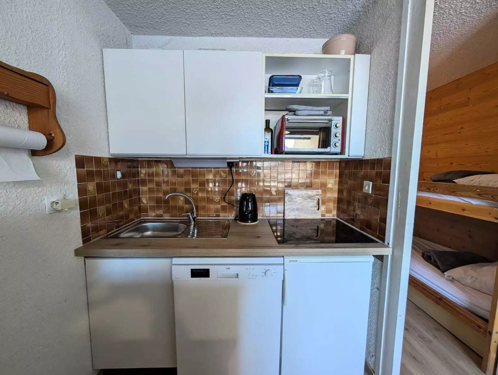Coin cuisine : un réfrigérateur top, un lave-vaisselle, 4 plaques électriques, un petit four grill, micro-ondes, cafetière filtre, bouilloire électrique, grille-pain.