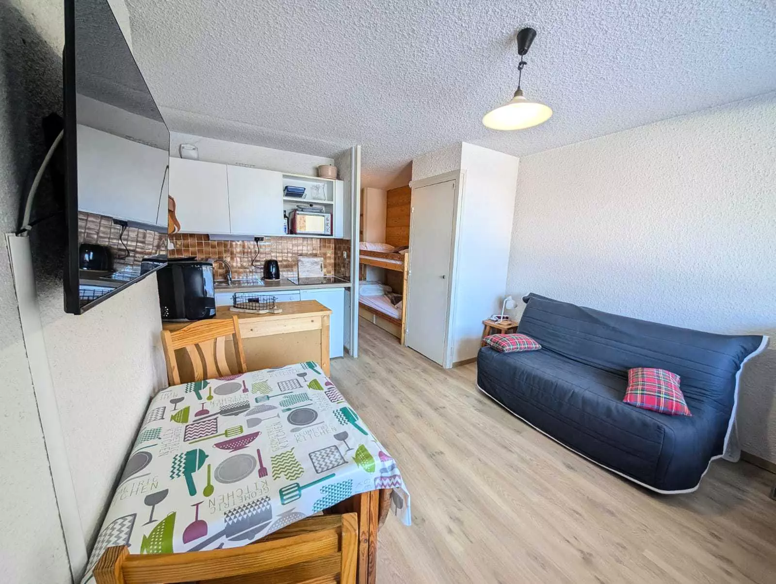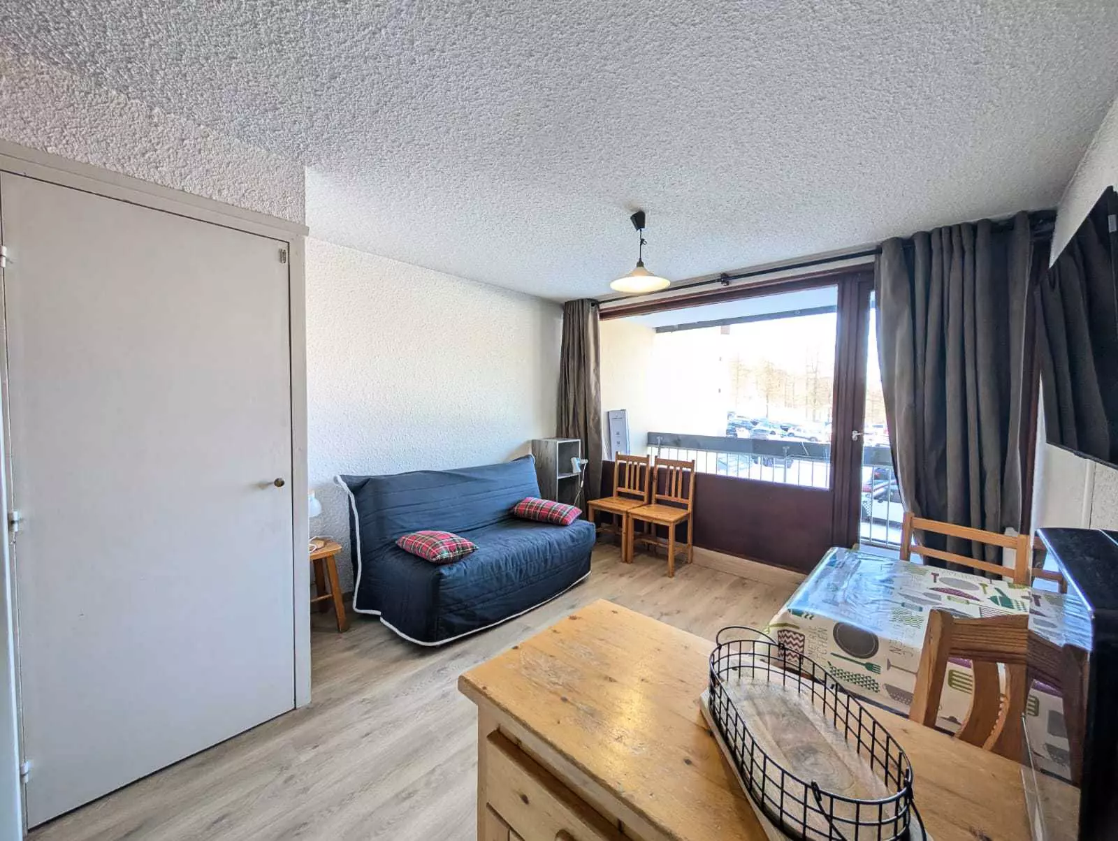 Séjour : Canapé, télévision, accès balcon, coin repas avec table et chaises pour 4 personnes.