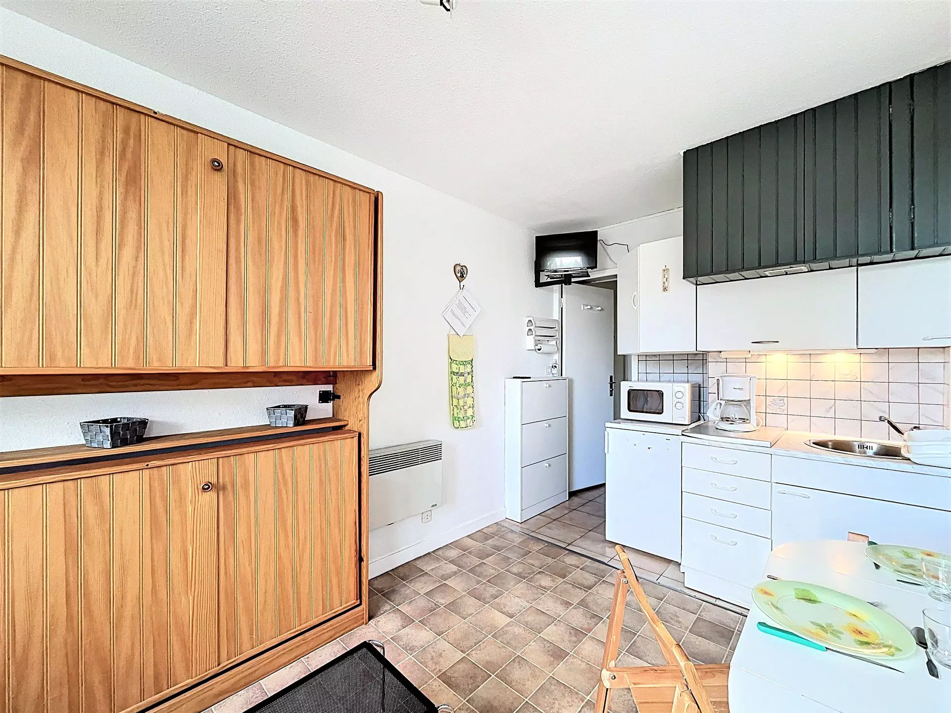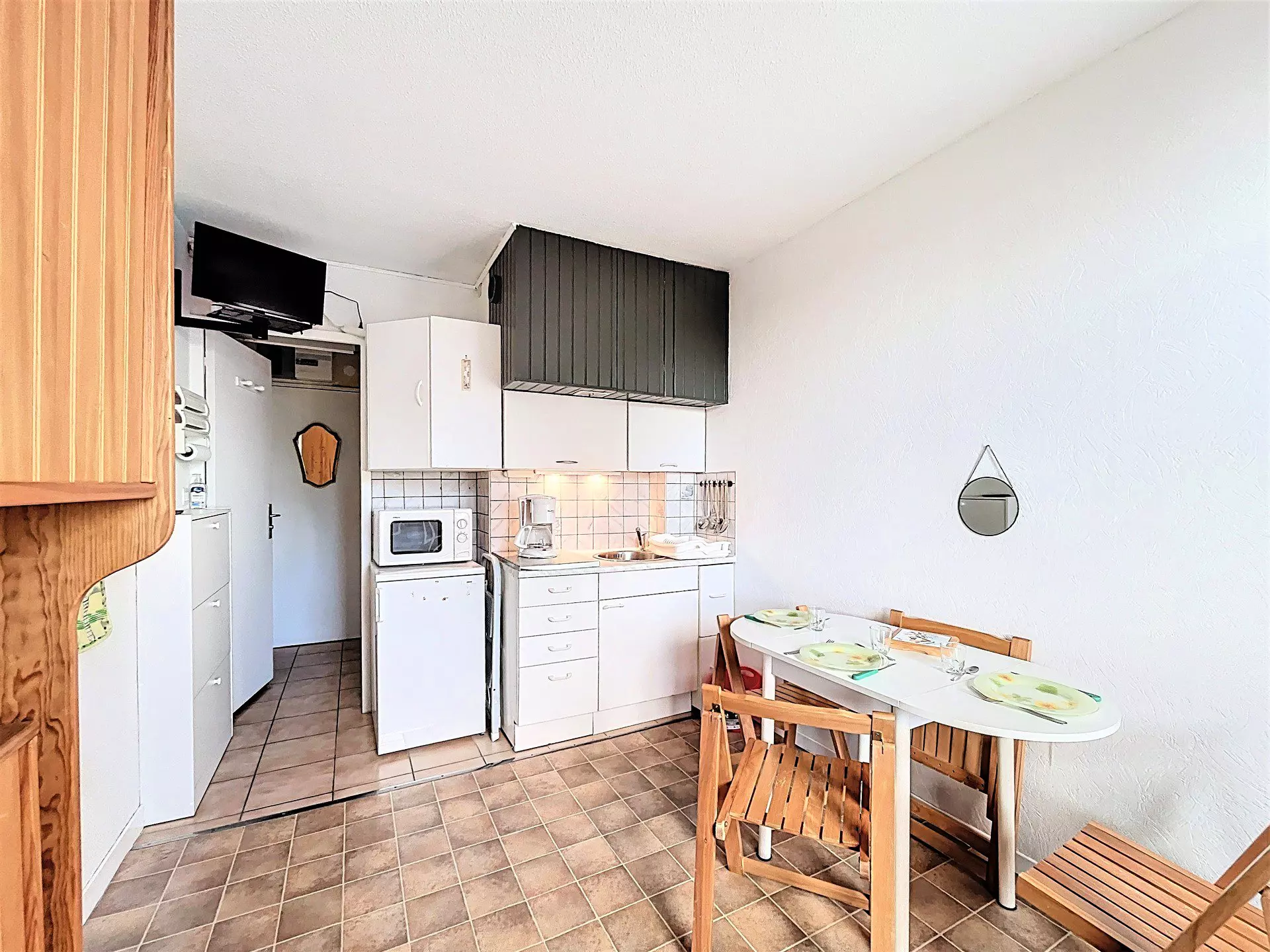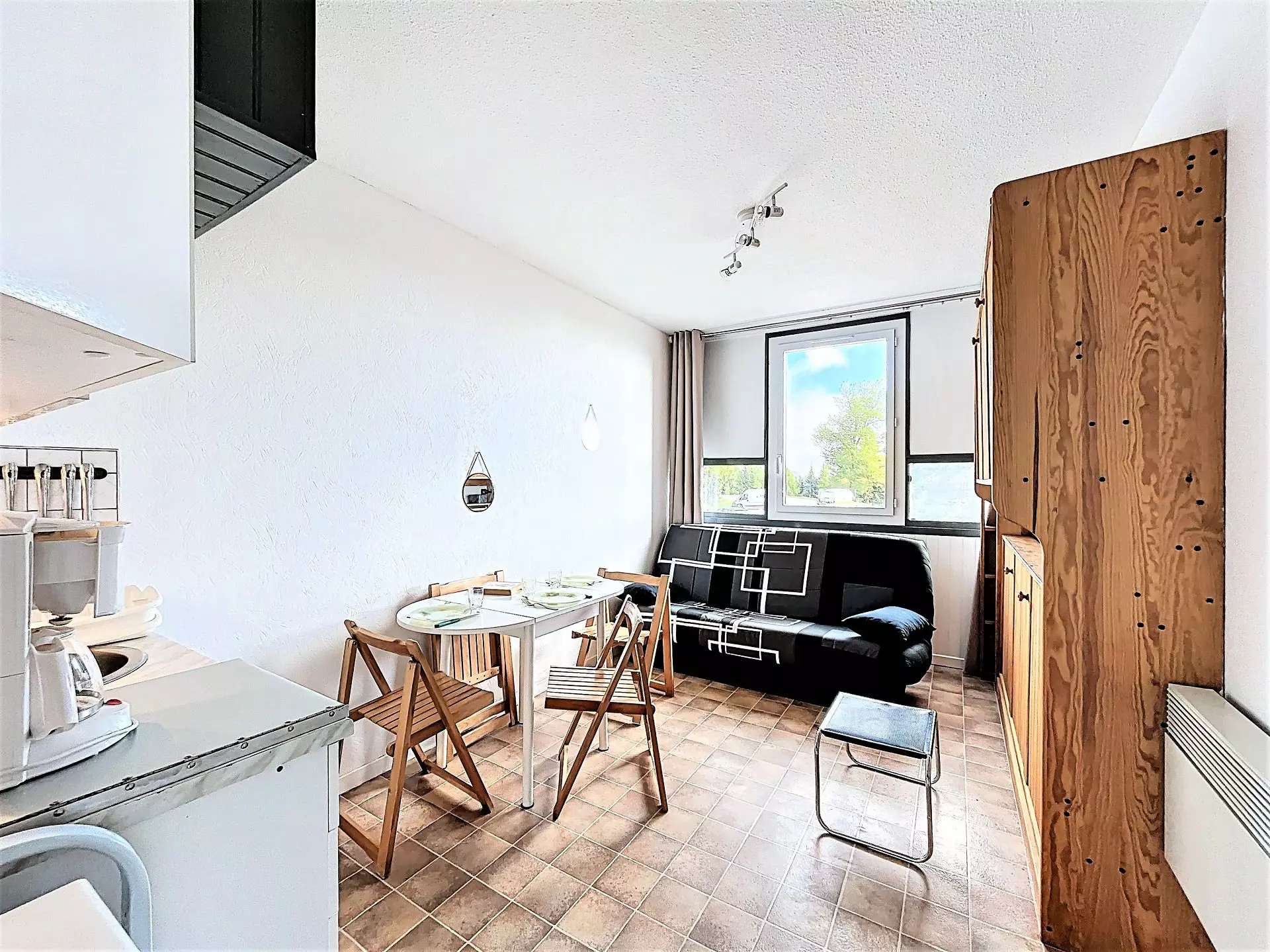 Ce studio bien entretenu sera idéal pour 2 adultes et 1 enfant. Il comprend : une entrée, un placard de rangement, une salle de bain avec toilettes, un coin kitchenette équipé de 2 plaques vitrocéramiques, un réfrigérateur top, un four micro-ondes, une cafetière électrique, une bouilloire, appareil à raclette et à fondue.
