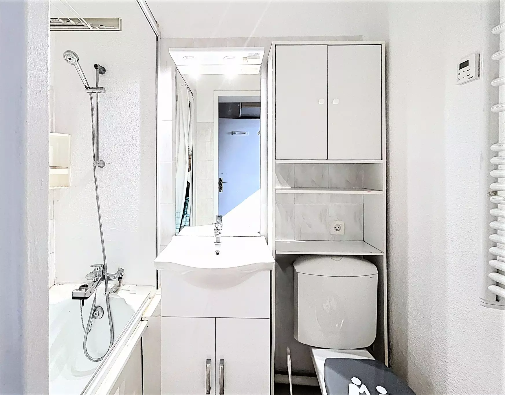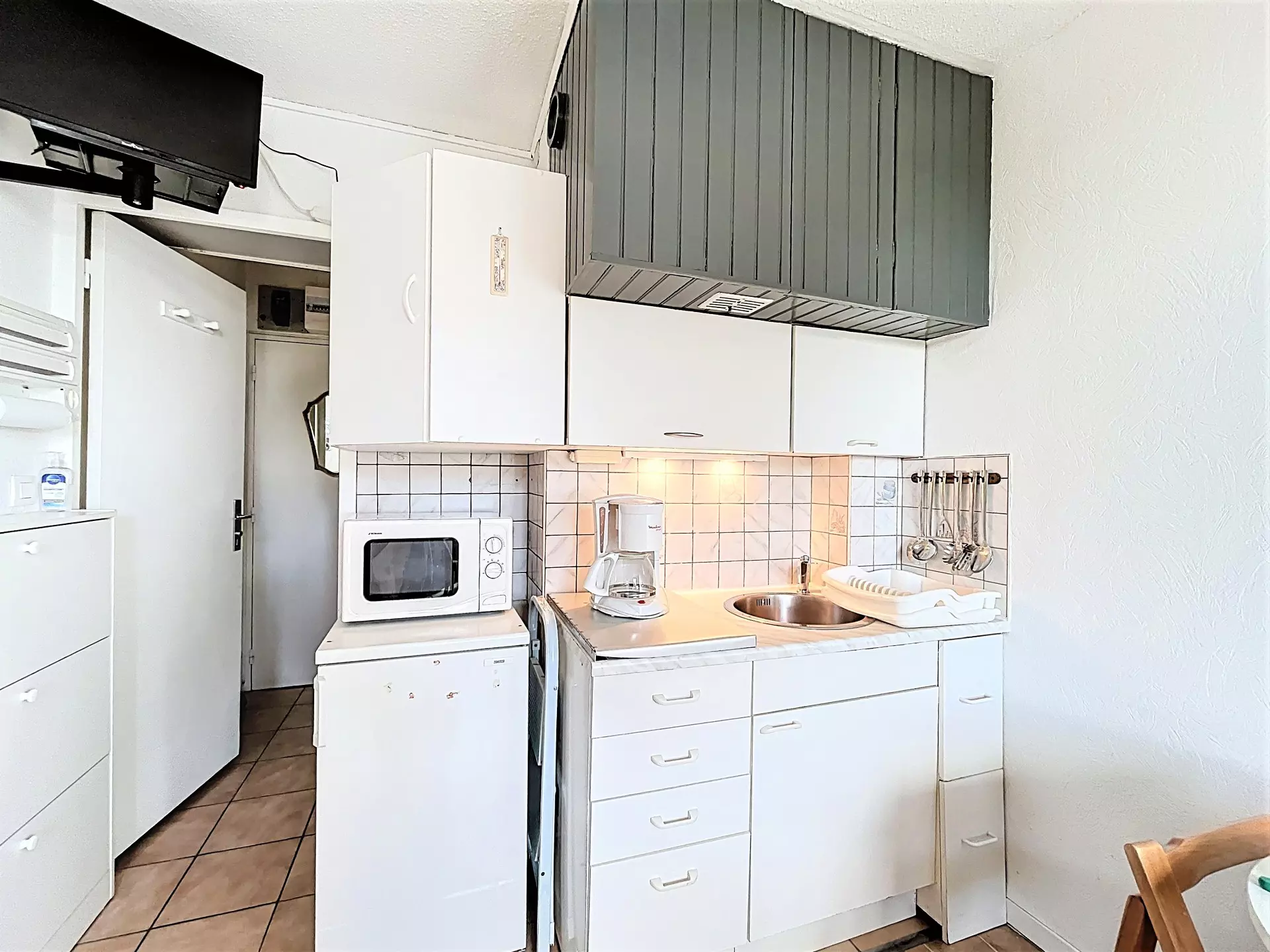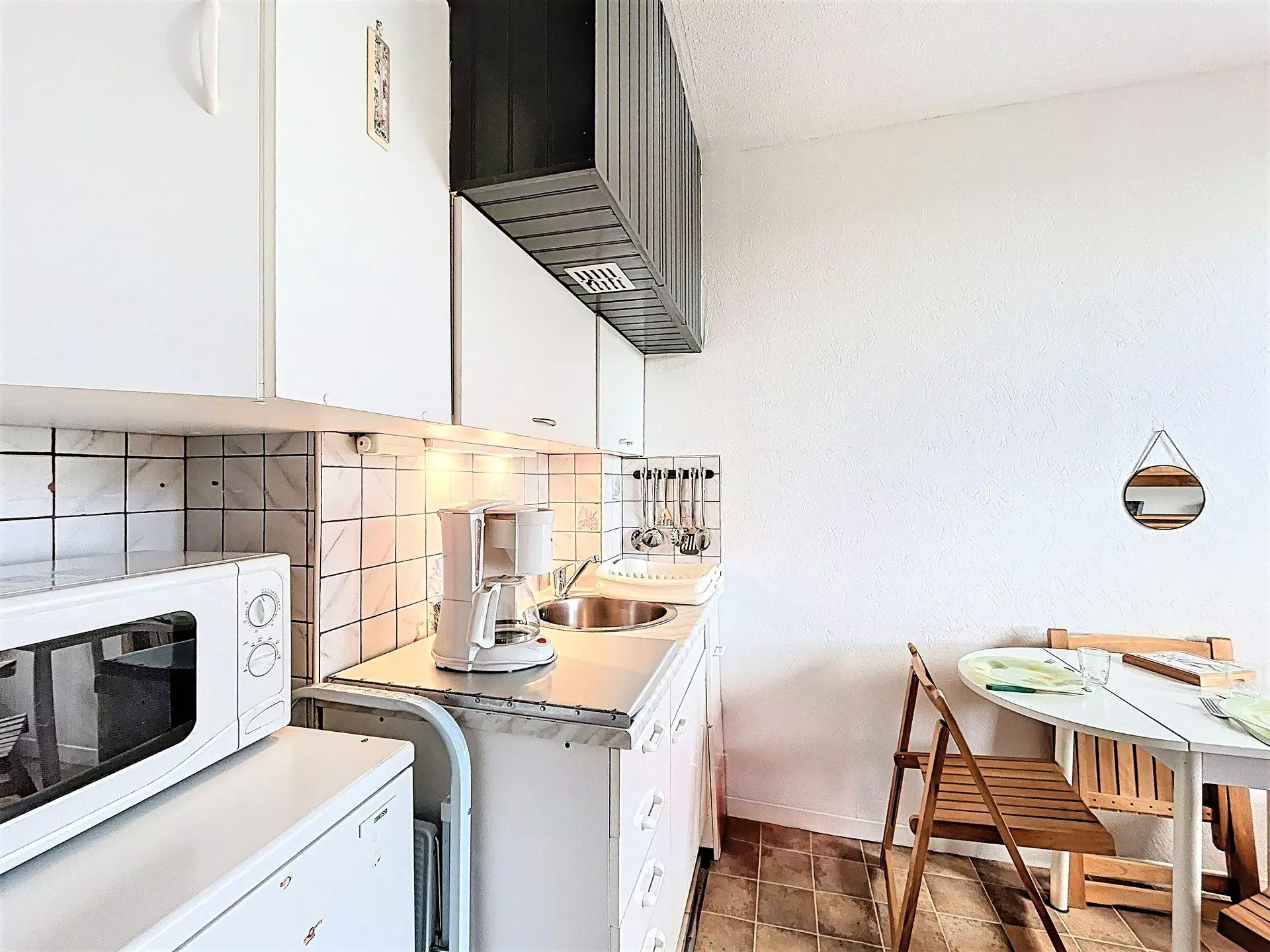 Ce studio bien entretenu sera idéal pour 2 adultes et 1 enfant. Il comprend : une entrée, un placard de rangement, une salle de bain avec toilettes, un coin kitchenette équipé de 2 plaques vitrocéramiques, un réfrigérateur top, un four micro-ondes, une cafetière électrique, une bouilloire, appareil à raclette et à fondue.