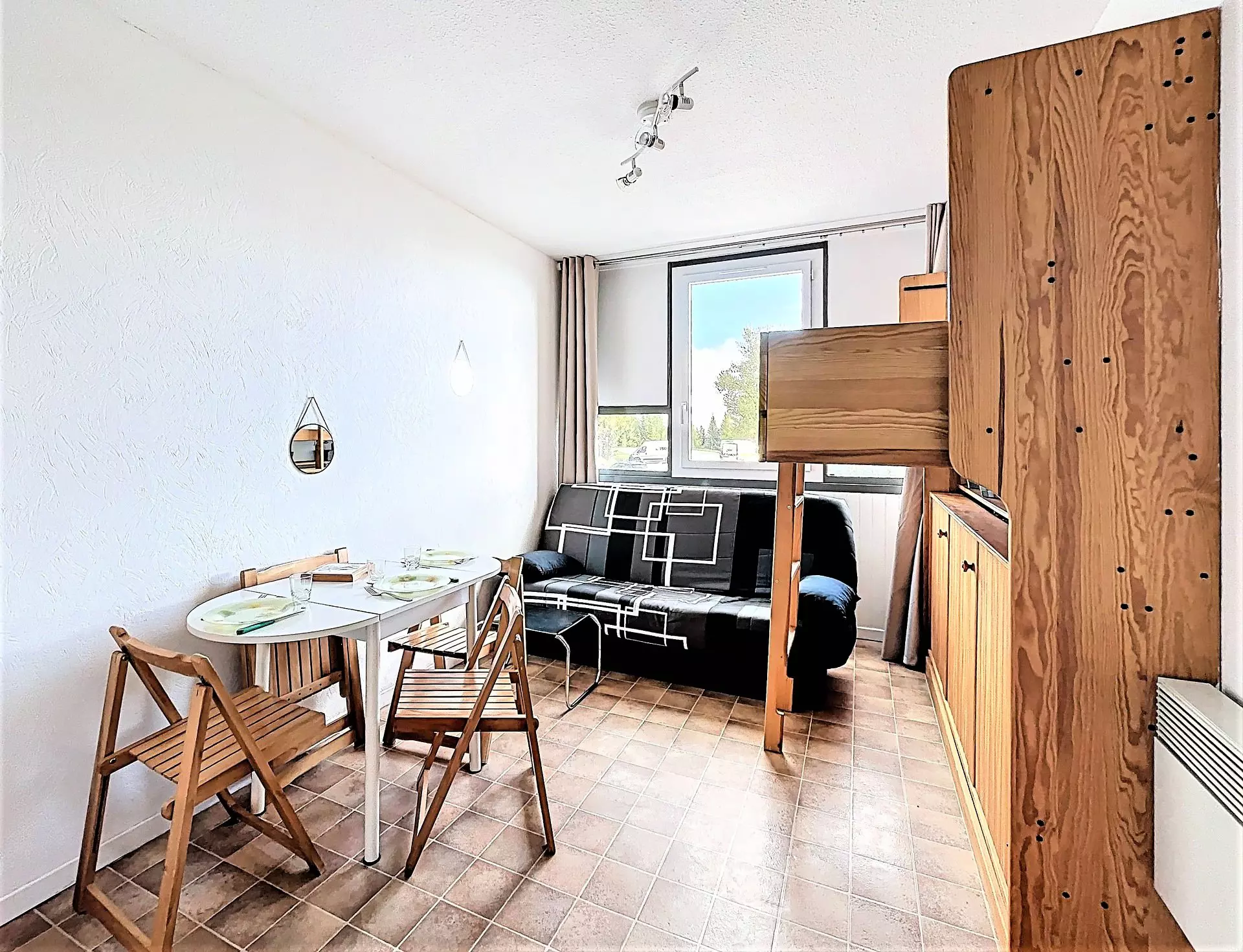 Un séjour avec 1 canapé convertible clic clac et 1 lit superposé pour 1 personne ainsi qu'une télévision à écran plat.