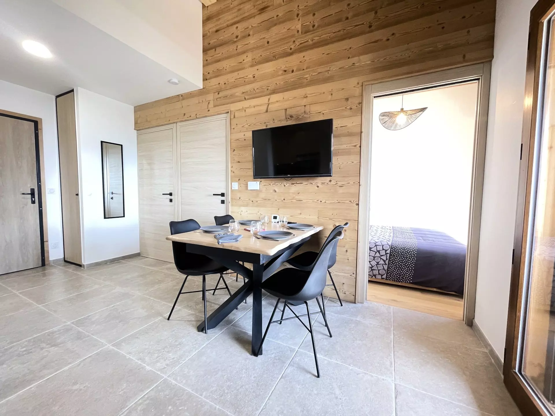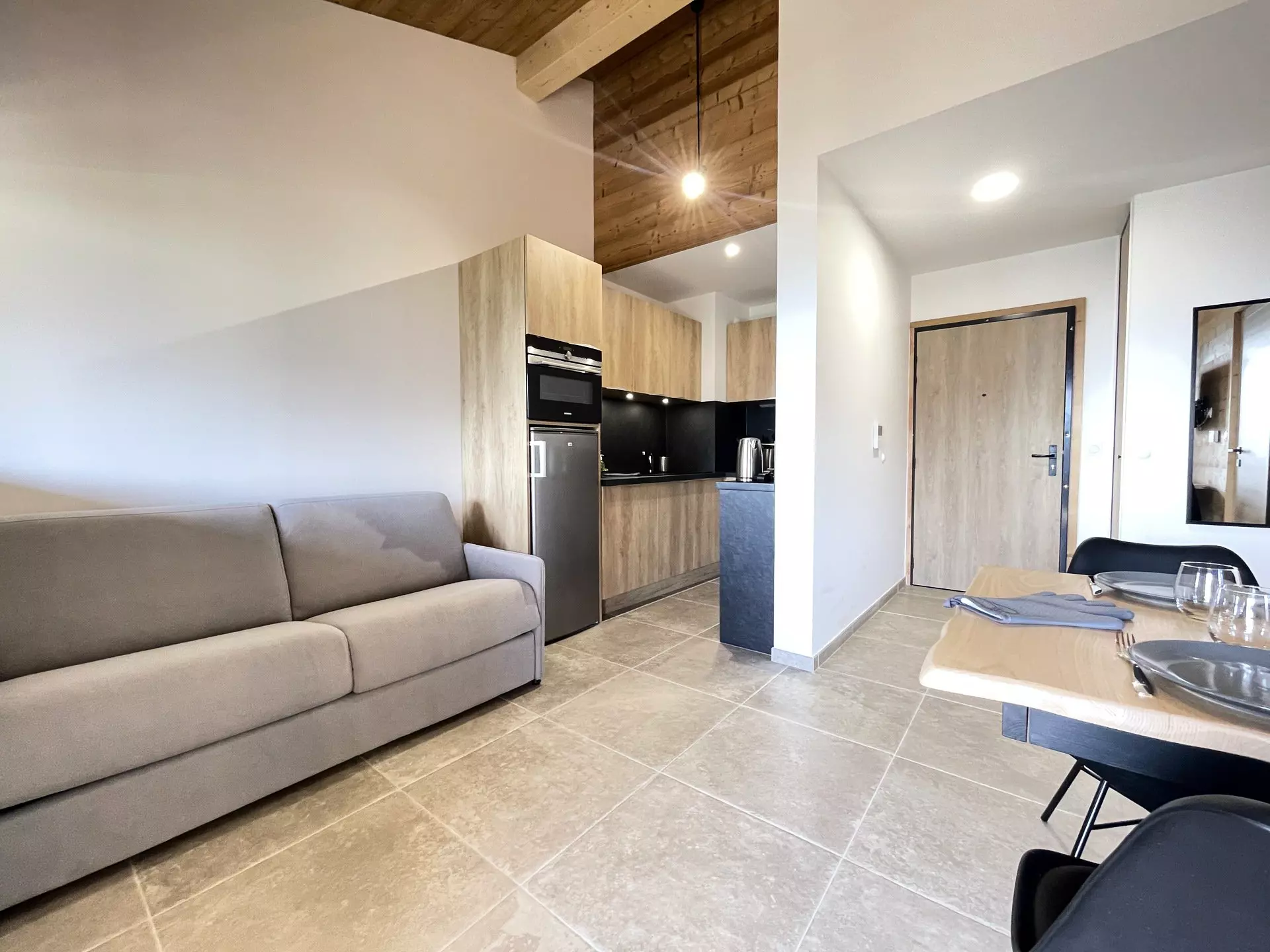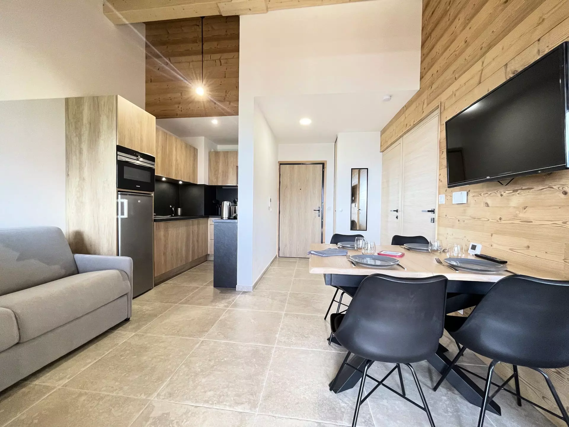 Ce bel appartement neuf d'environ 35 m² se situe à proximité de la place du cernix. Il dispose d'une terrasse meublée orientée Sud, idéale pour savourer des déjeuners en plein air. Il est conçu pour accueillir quatre personnes , idéalement 2 adultes et 2 enfants. Situé au 3ème étage, l'appartement offre une vue dégagée sans vis à vis sur la chaine des Aravis (résidence avec ascenseur). La résidence Canopée, composée de 2 bâtiments, est située à environ 500m à pied des commerces de proximité et du télésiège du Cernix. Les vacanciers apprécieront également la navette gratuite située à seulement 100 mètres, facilitant l’accès aux pistes.