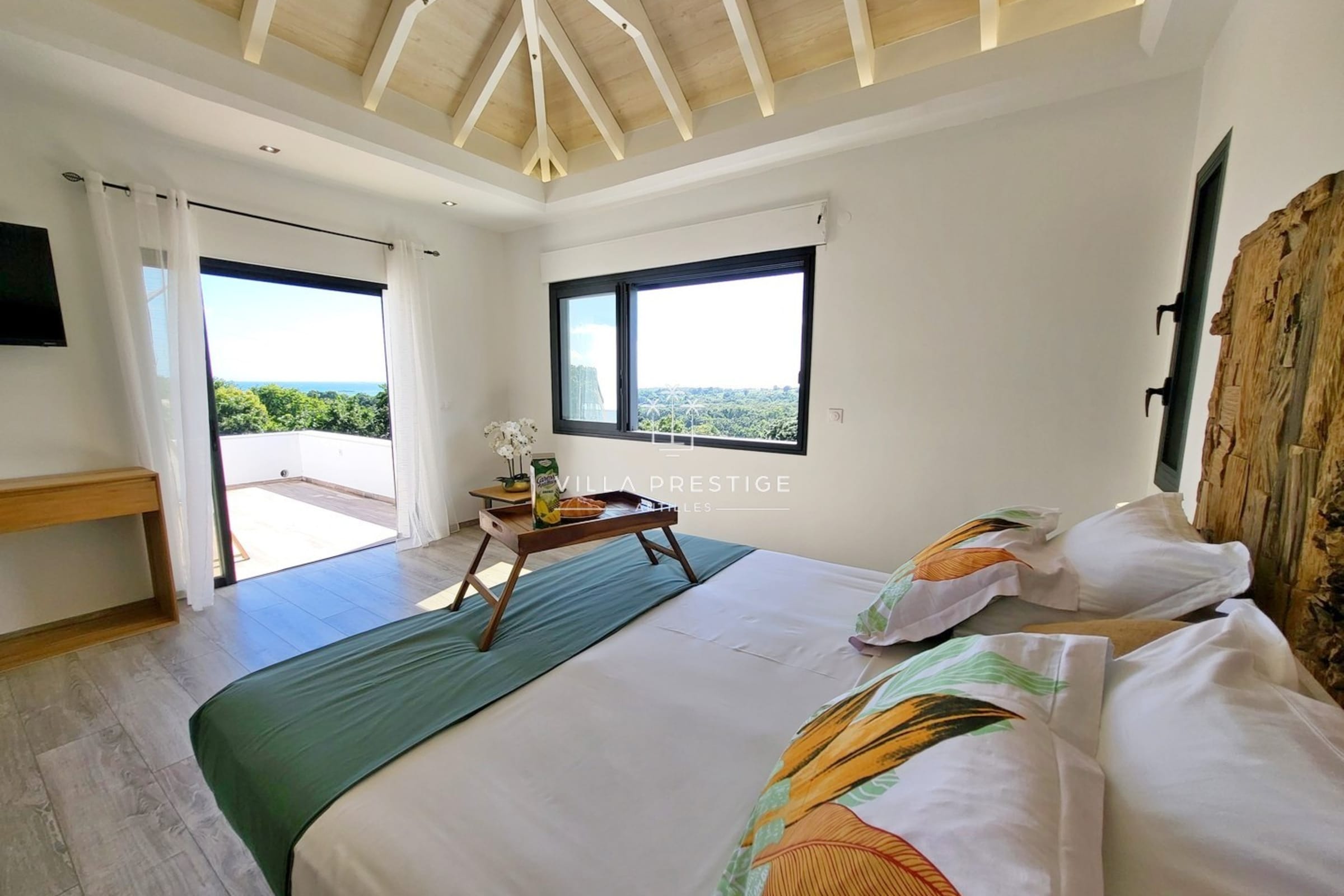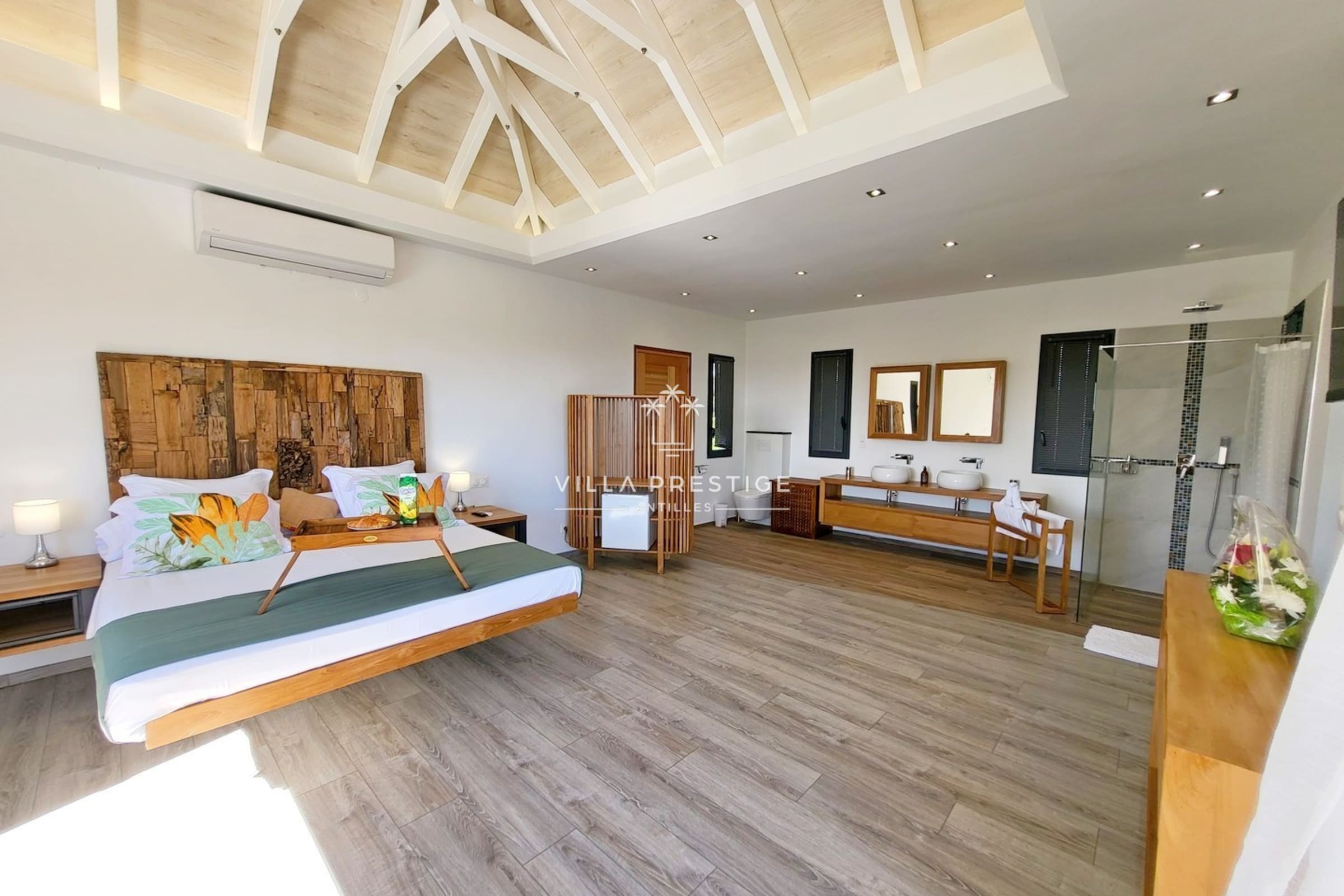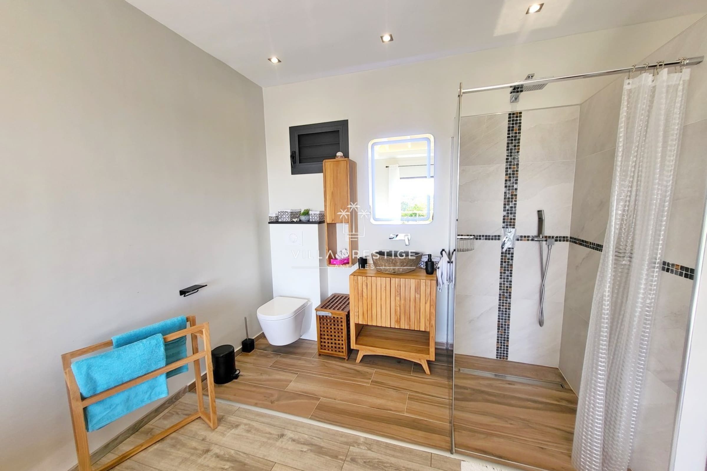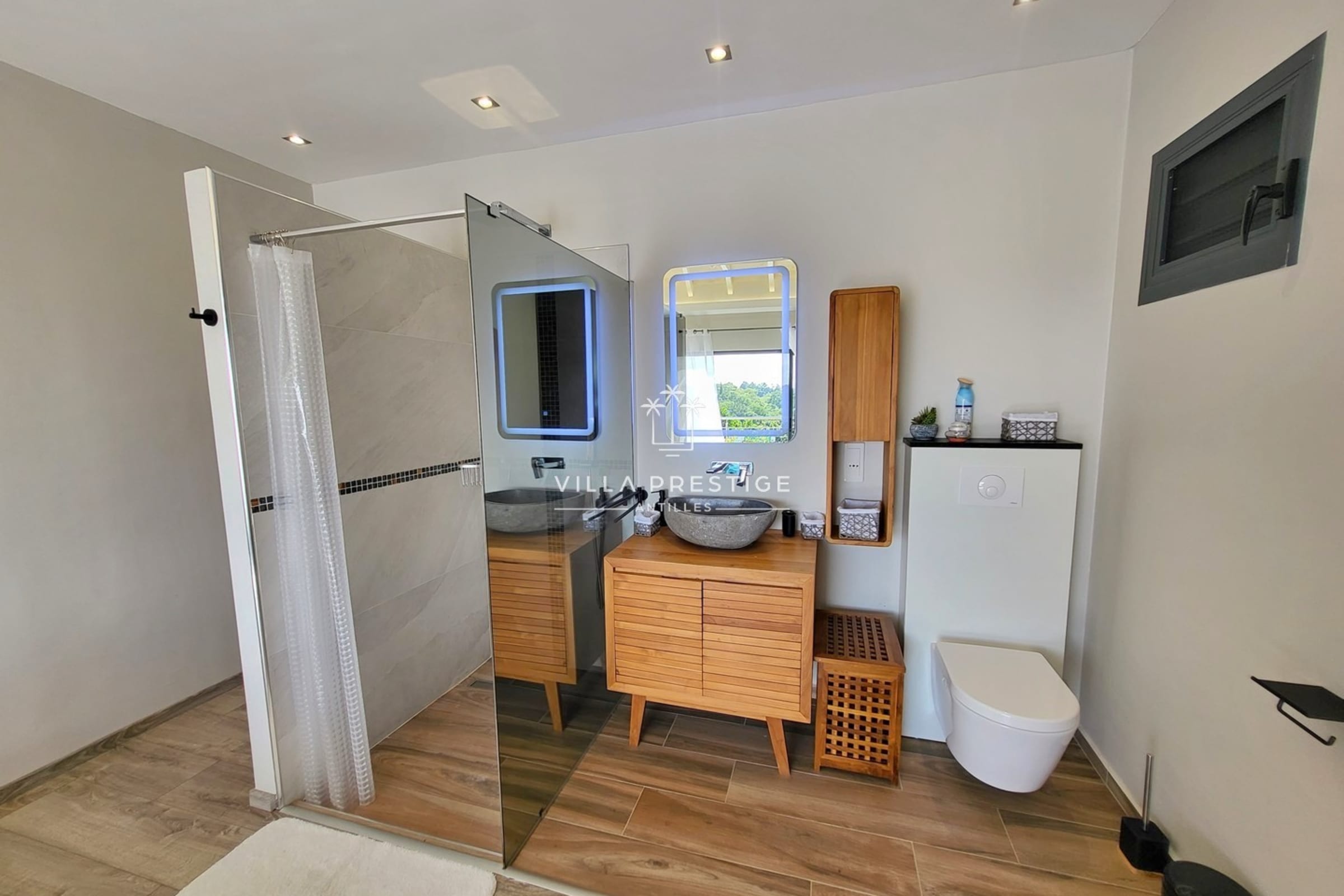 La villa s’ouvre sur une grande terrasse avec vue mer et montagne, une superbe piscine au sel avec plage immergée et des coins détente ombragés. Le jardin paysager, agrémenté d’un terrain de pétanque et d’un bar à punch, invite à la convivialité. Un barbecue est également à disposition pour vos repas en plein air. Parking sécurisé sur place.