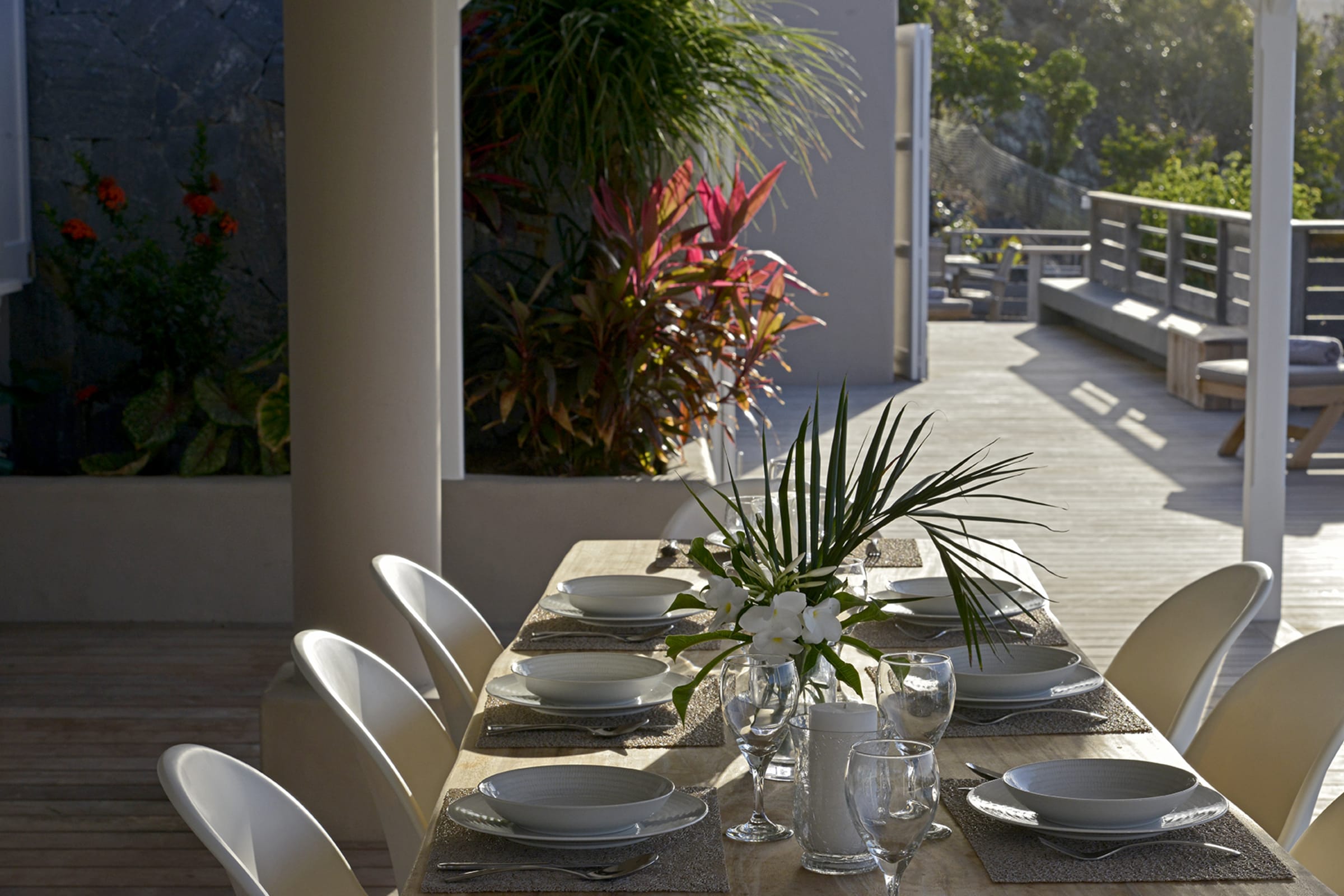 Sur la grande terrasse, profitez pleinement de la piscine avec vue imprenable sur l’océan. Des transats et parasols sont installés sur le deck pour savourer des instants de détente ou de lecture dans une ambiance sereine. Le jardin tropical, riche en végétation luxuriante, encadre avec grâce ce décor exceptionnel, ouvrant la vue sur la mer et les îles voisines. Un véritable havre de paix, où calme et douceur de vivre se conjuguent à la perfection.