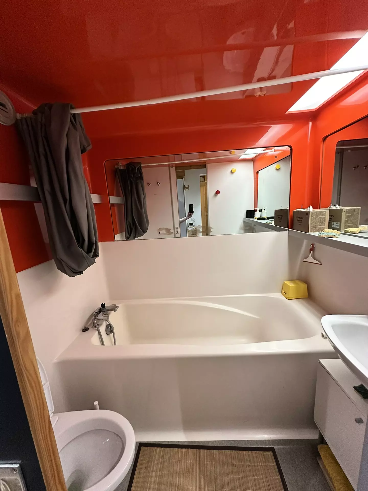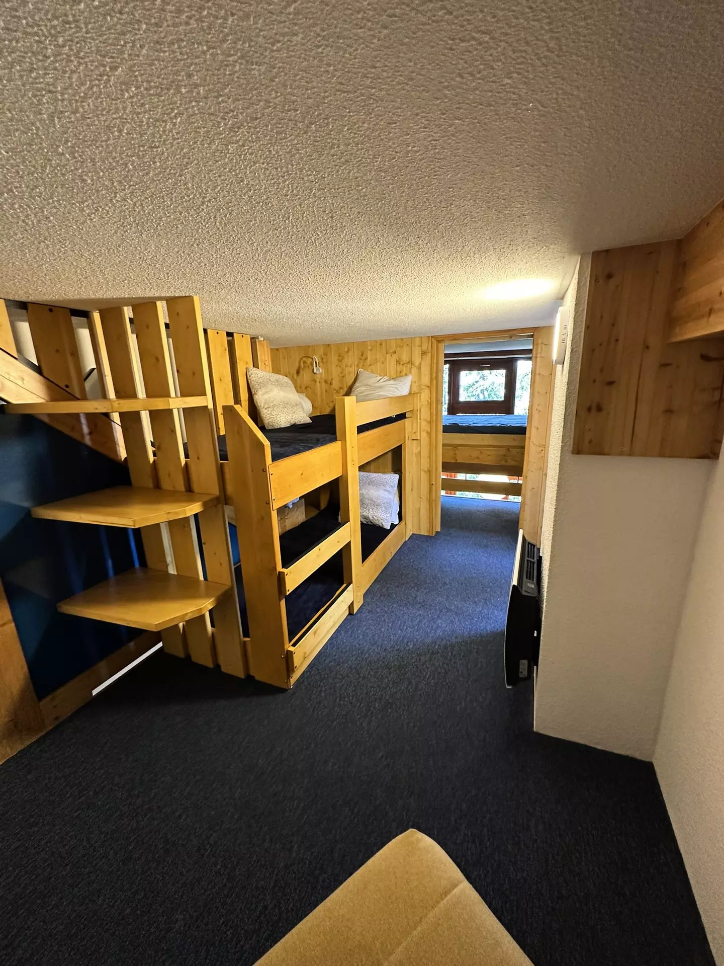 A l'étage (hauteur de la mezzanine est inférieure à 1m80) un dégagement avec 2 lits superposés, et un autre espace nuit fermé sur le séjour, avec un lit double.