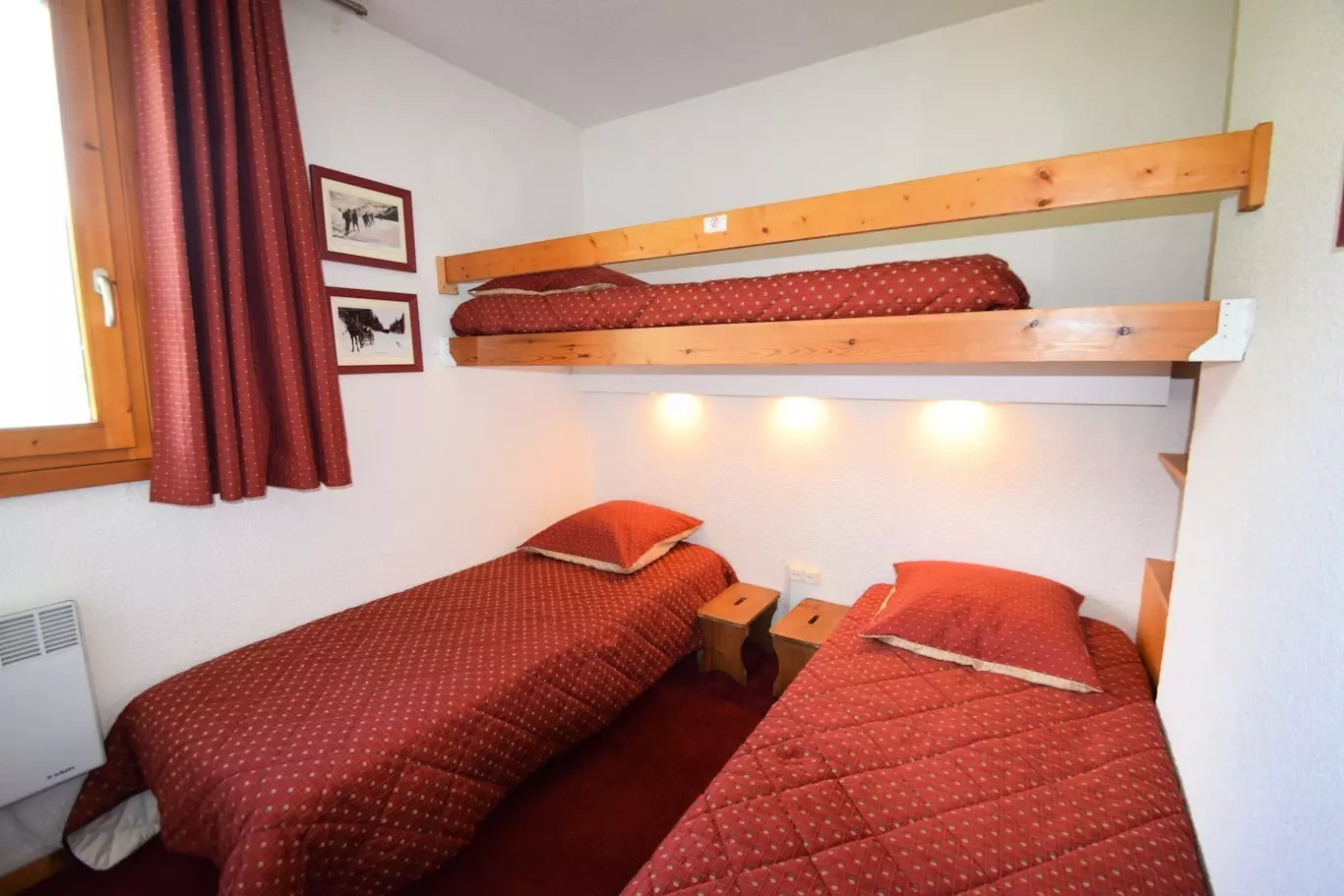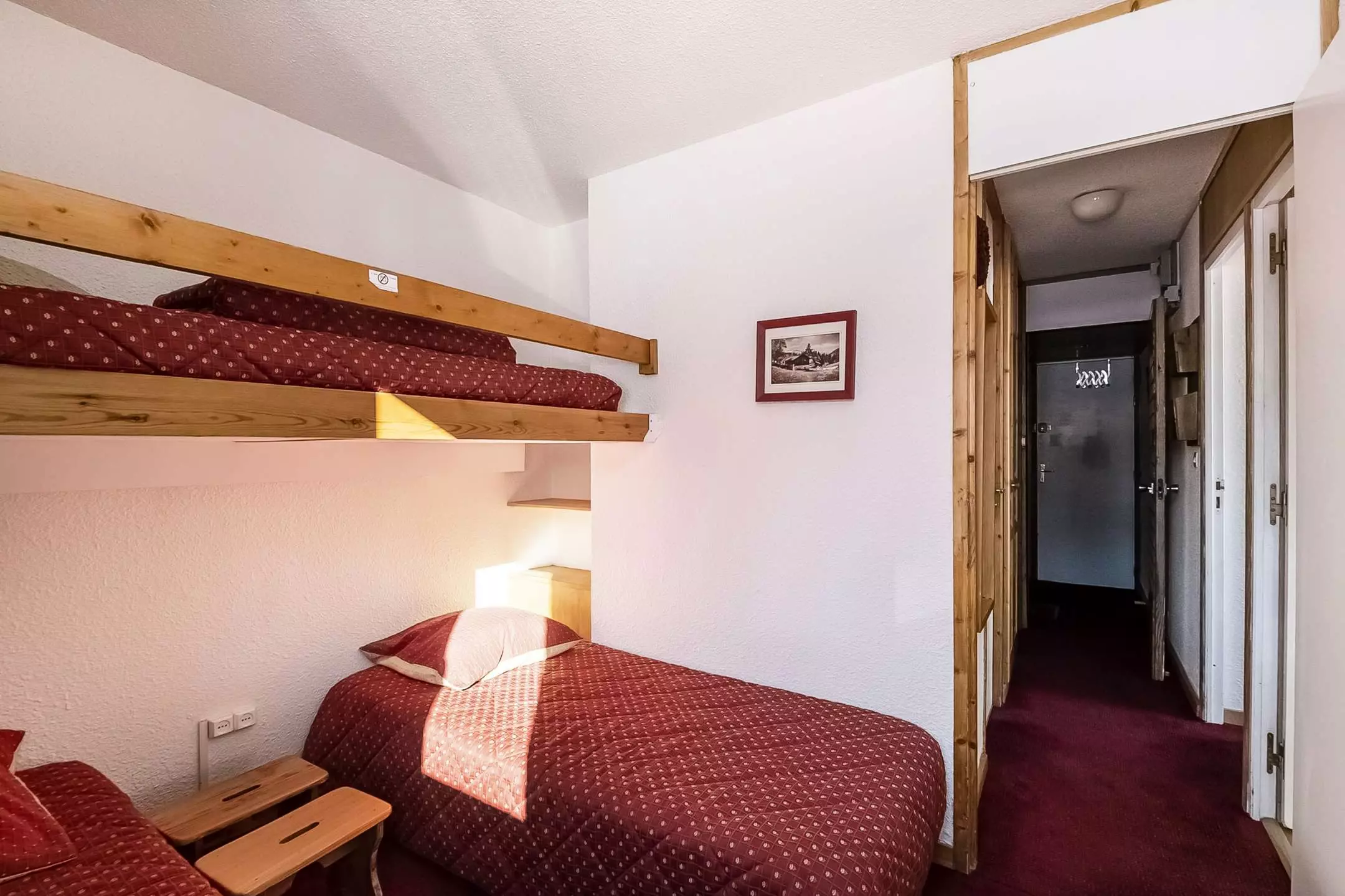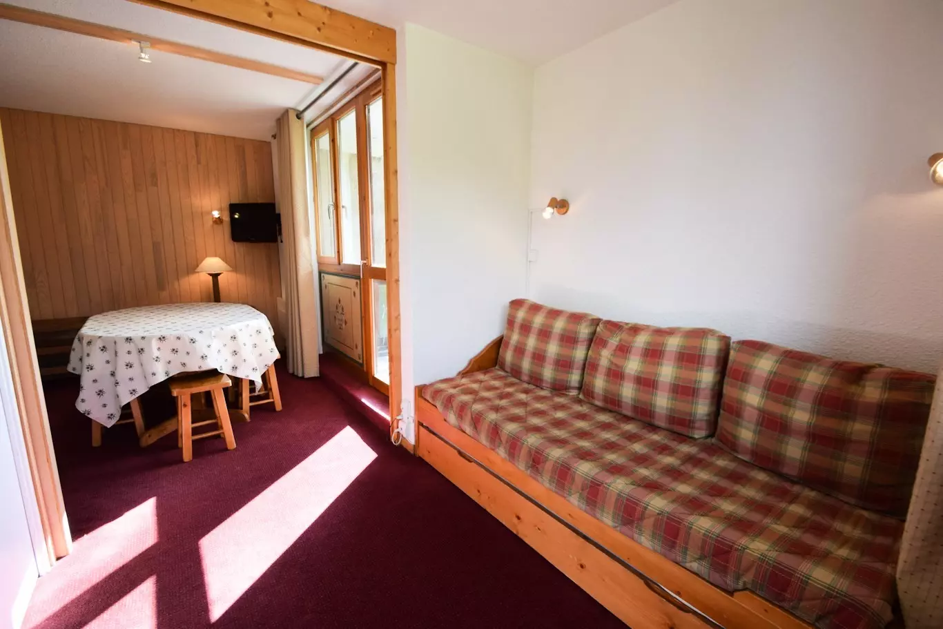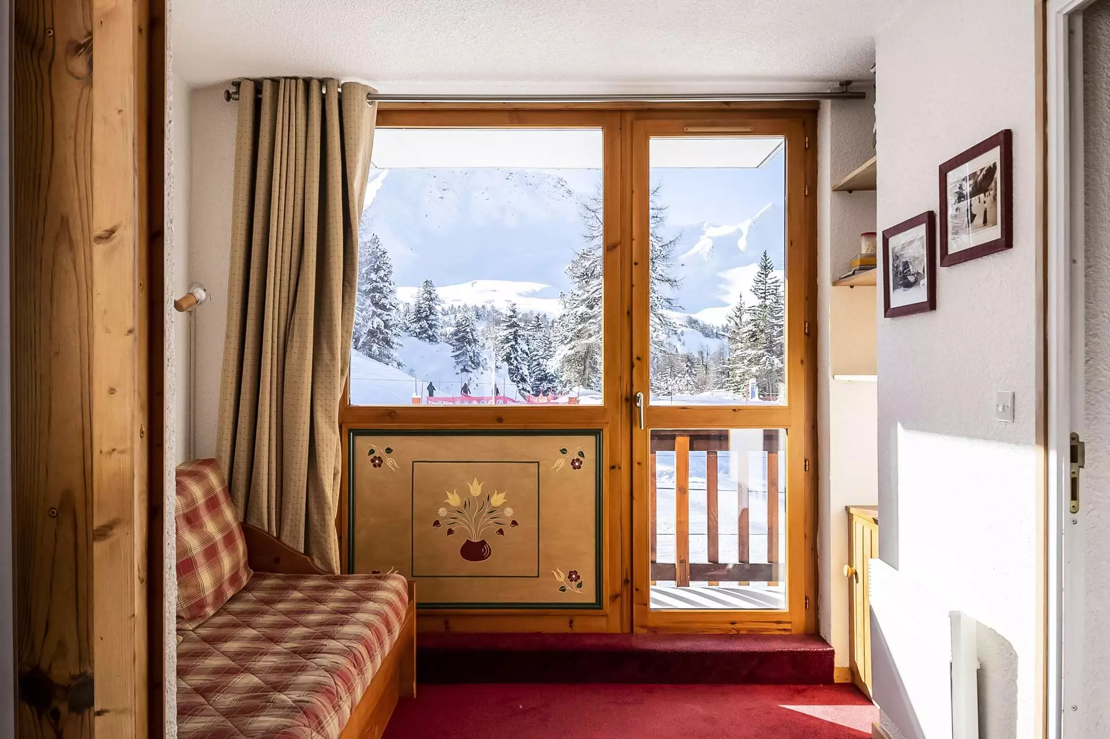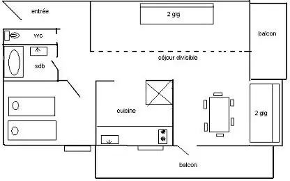 Appt 2 pièces divisible 6 pers., 42m2, exposé est et sud/ouest avec 2 balcons, vue sur les pistes, 2ème étage avec ascenseur - Cuisine séparée : 2 plaques vitro-céramiques, réfrigérateur, four combiné, LV - Séjour : coin repas, 2 lits gigognes 1 pers, TV - Partie divisible : 2 lits gigognes - Chambre : 2 lits 1 pers (possibilité de les rapprocher pr former 1 grand lit) - SDB : baignoire, WC séparés - Literie : couvertures - Ménage de fin de séjour, draps et serviettes et forfaits ski en option.Casier à skis : N° 206 au RDC - Appartement lumineux idéalement situé.