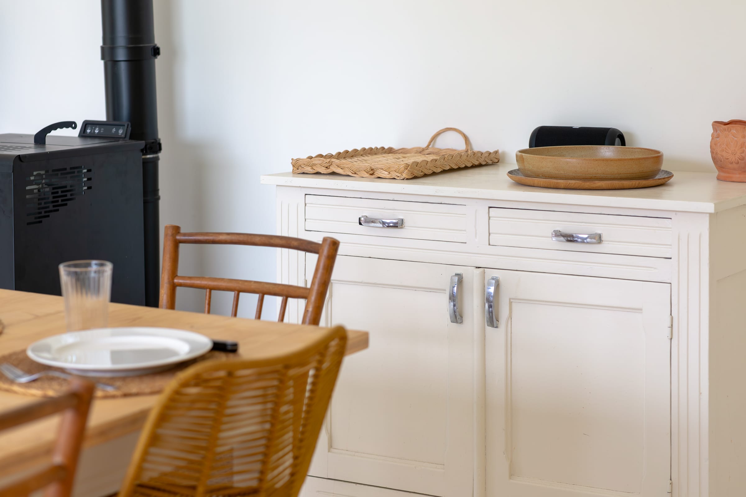 Le séjour lumineux, ouvert sur la terrasse, dispose d’une TV avec Netflix, de baies vitrées exposées est, sud et ouest, et d’une charmante banquette fixe orientée plein ouest, parfaite pour lire ou admirer la campagne.