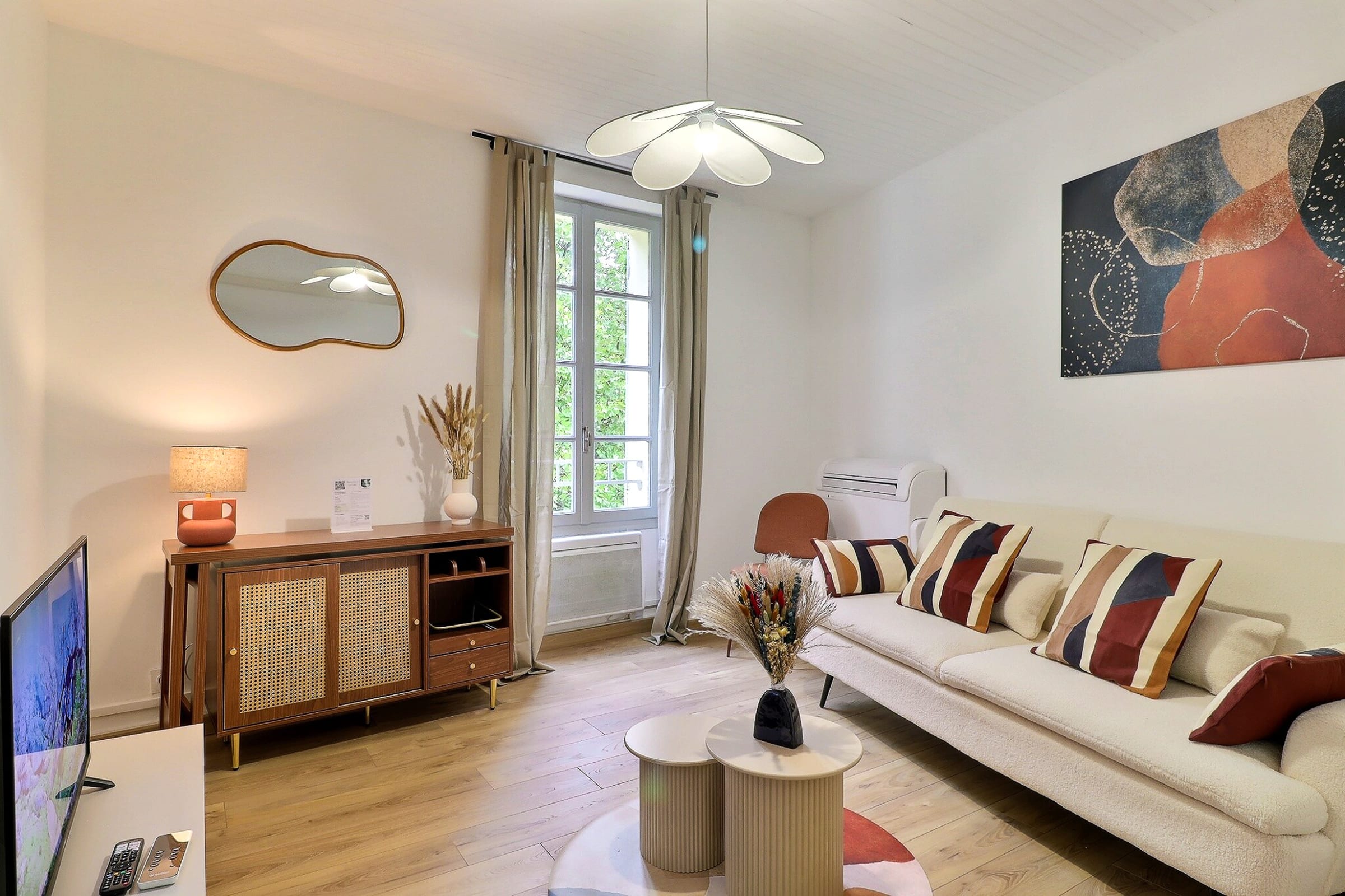 Le salon climatisé, décoré avec soin, allie tons naturels et touches végétales. Vous y trouverez un canapé confortable, un coin repas convivial ainsi qu’une télévision connectée pour des soirées détente après une journée de découvertes.