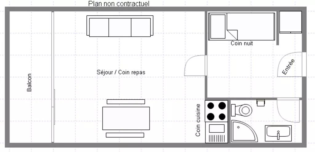 Pour 4 personnes, cet appartement est composé d’une entrée avec 2 lits superposés, d’un séjour équipé d’une banquette + lit gigogne, un coin cuisine ainsi que qu'une salle de douche avec WC.