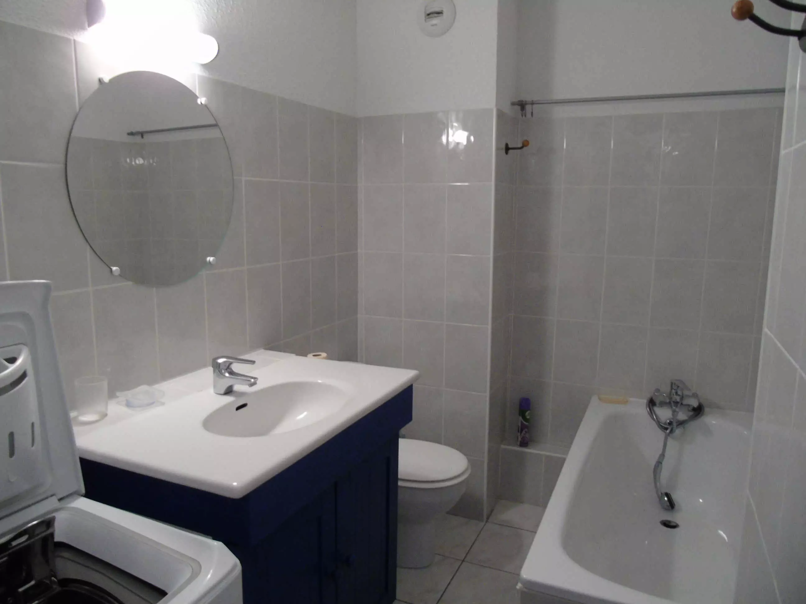 - Salle de bain avec baignoire, lavabo, sèche-cheveux, lave-linge et WC