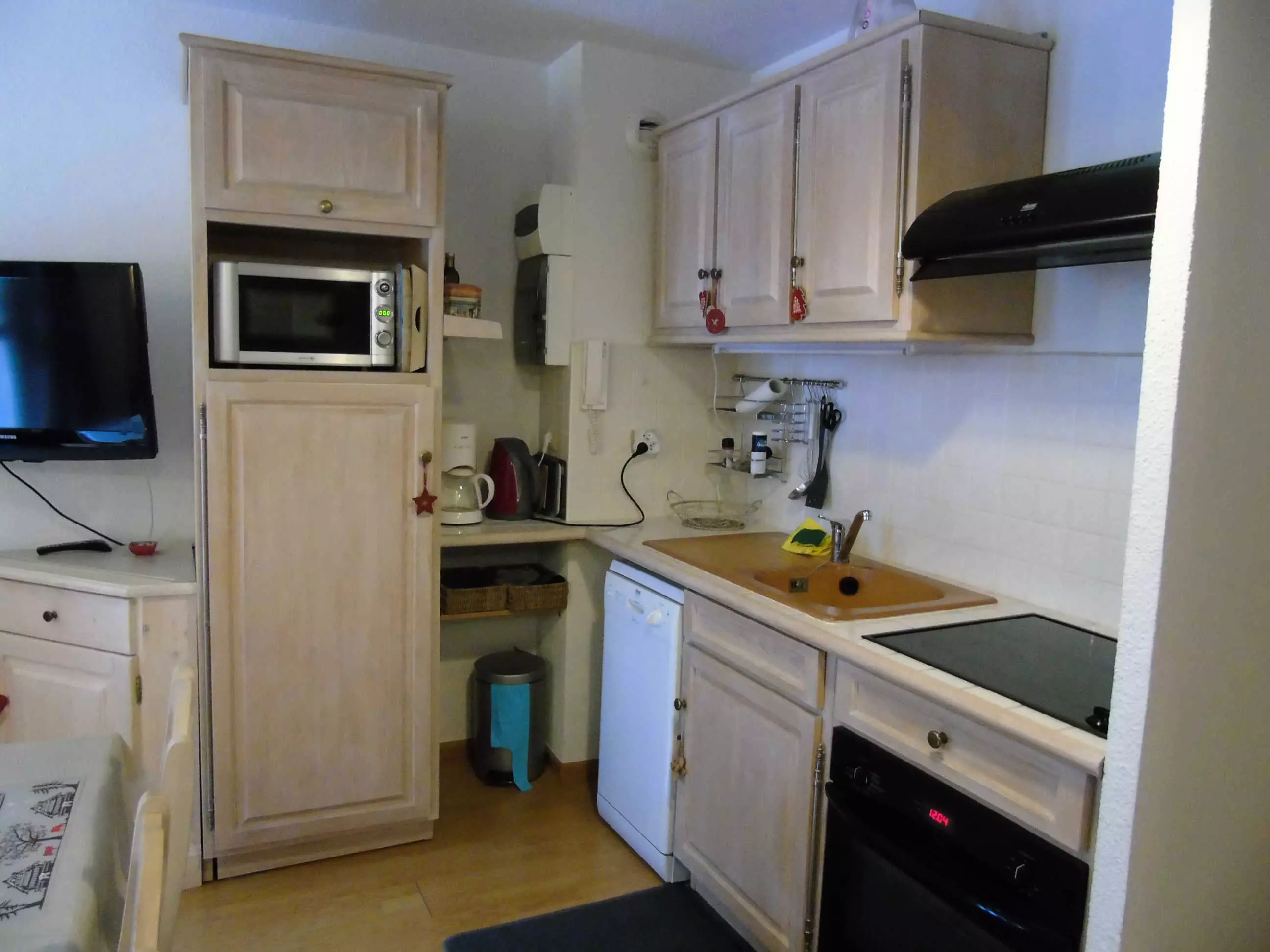- Coin cuisine équipé : plaque vitrocéramique 4 feux, hotte, micro-ondes, four, réfrigérateur, lave-vaisselle, cafetière à filtre, cafetière Senseo, bouilloire