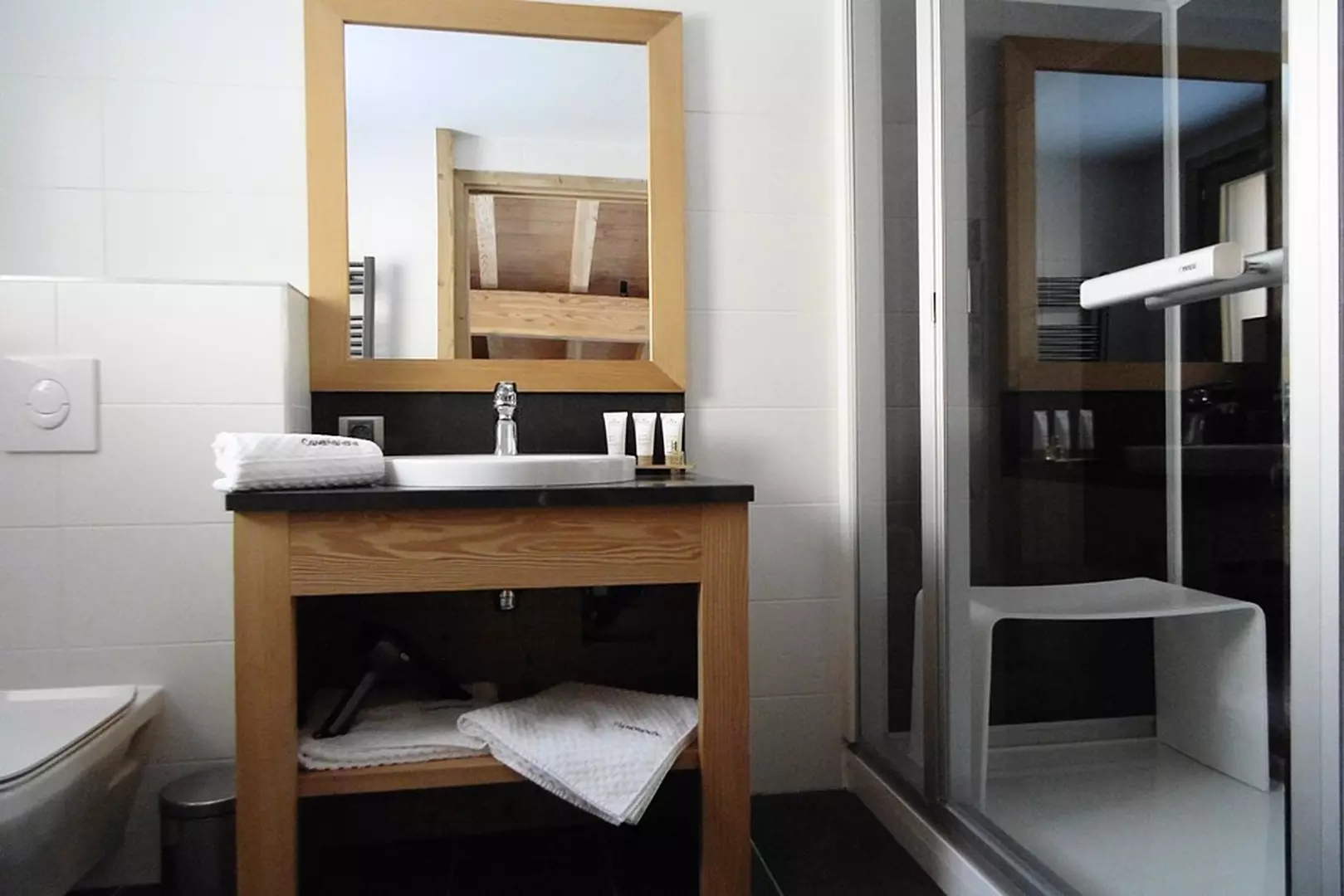 Chambre 6 mezzanine en suite : 1 lit double avec bureau, douche hammam et toilettes.